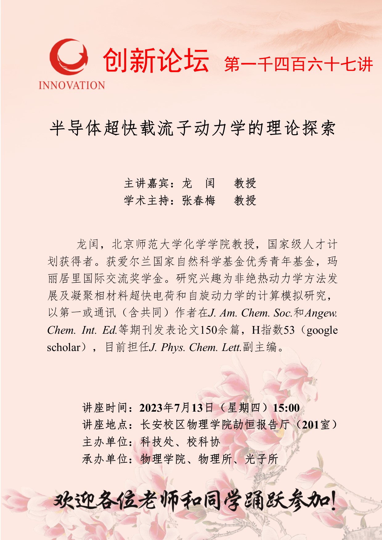 龙闰 教授 bat365正版唯一官网创新论坛第一千四百六十七讲:半导体超快载流子动力学的理论探索 讲座时间 2023年7月13日(星期四)15:00 讲座地点 长安校区物理学院劼恒报告厅(201室) 讲座人介绍 龙闰 教授 讲座内容