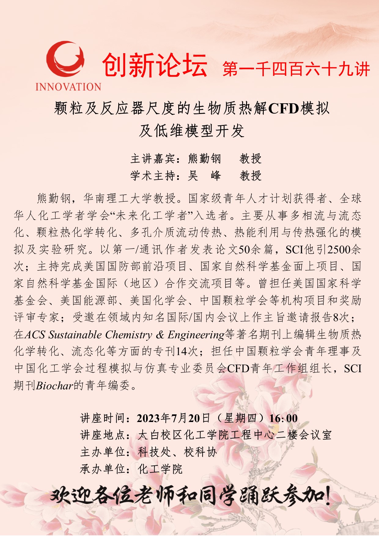 熊勤钢 教授 bat365正版唯一官网创新论坛第一千四百六十九讲:颗粒及反应器尺度的生物质热解CFD模拟 讲座时间 2023年7月20日(星期四)16:00 讲座地点 太白校区化工学院工程中心二楼会议室 讲座人介绍 熊勤钢 教授 讲座内容