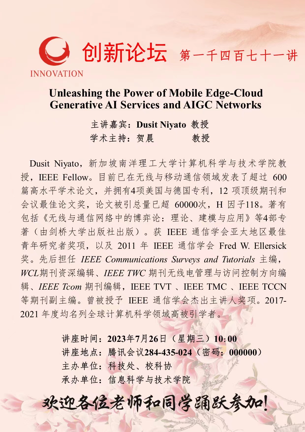 Dusit Niyato 教授 bat365正版唯一官网创新论坛第一千四百七十一讲:Unleashing the Power of Mobile Edge-Cloud Generative AI Services and AIGC Networks 讲座时间 2023年7月26日(星期三)10:00 讲座地点 腾讯会议284-435-024(密码:000000) 讲座人介绍 Dusit Niyato 教授 讲座内容