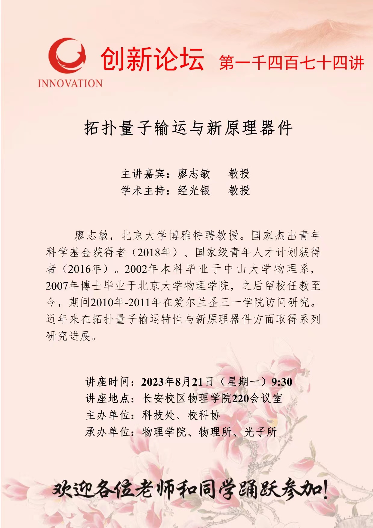 廖志敏 教授 bat365正版唯一官网创新论坛第一千四百七十四讲:拓扑量子输运与新原理器件 讲座时间 2023年8月21日(星期一)9:30 讲座地点 长安校区物理学院220会议室 讲座人介绍 廖志敏 教授 讲座内容