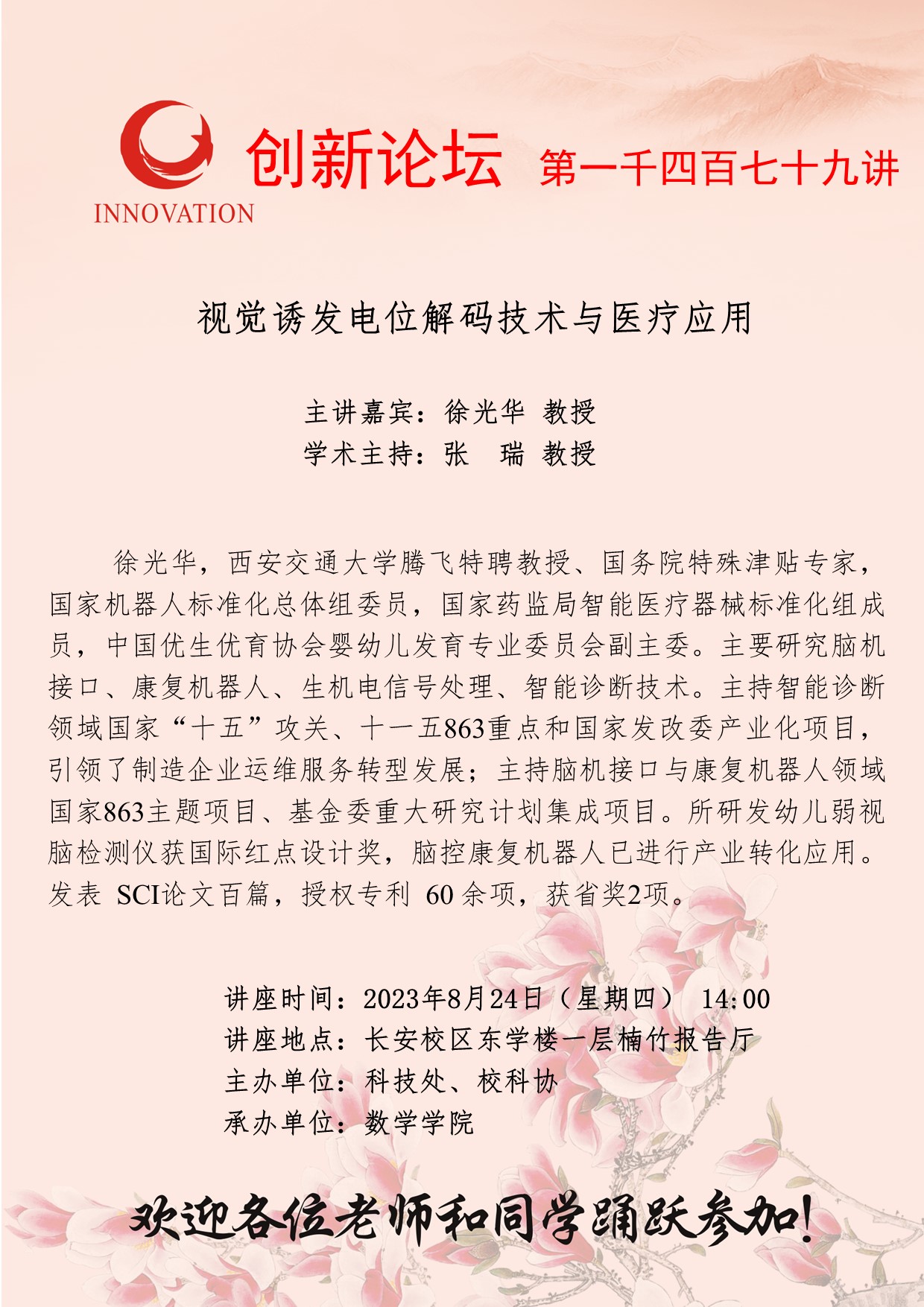 徐光华 教授 bat365正版唯一官网创新论坛第一千四百七十九讲:视觉诱发电位解码技术与医疗应用 讲座时间 2023年8月24日(星期四) 14:00 讲座地点 长安校区东学楼一层楠竹报告厅 讲座人介绍 徐光华 教授 讲座内容