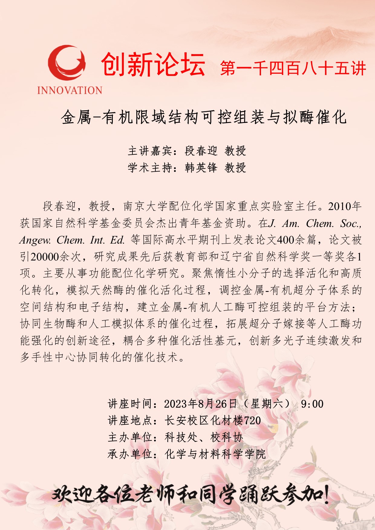 段春迎 教授 bat365正版唯一官网创新论坛第一千四百八十五讲:金属-有机限域结构可控组装与拟酶催化 讲座时间 2023年8月26日(星期六) 9:00 讲座地点 长安校区化材楼720 讲座人介绍 段春迎 教授 讲座内容