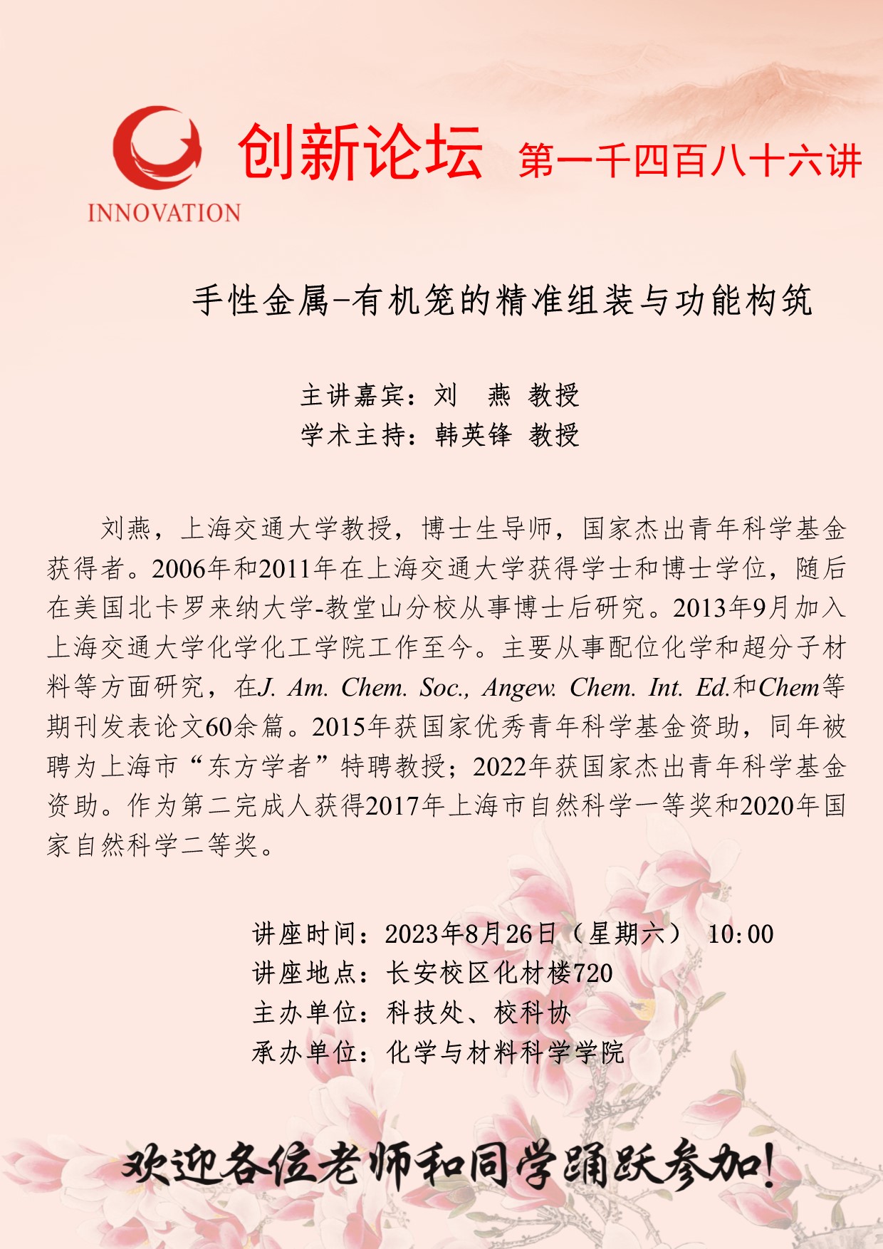 刘燕 教授 bat365正版唯一官网创新论坛第一千四百八十六讲:手性金属-有机笼的精准组装与功能构筑 讲座时间 2023年8月26日(星期六) 10:00 讲座地点 长安校区化材楼720 讲座人介绍 刘燕 教授 讲座内容