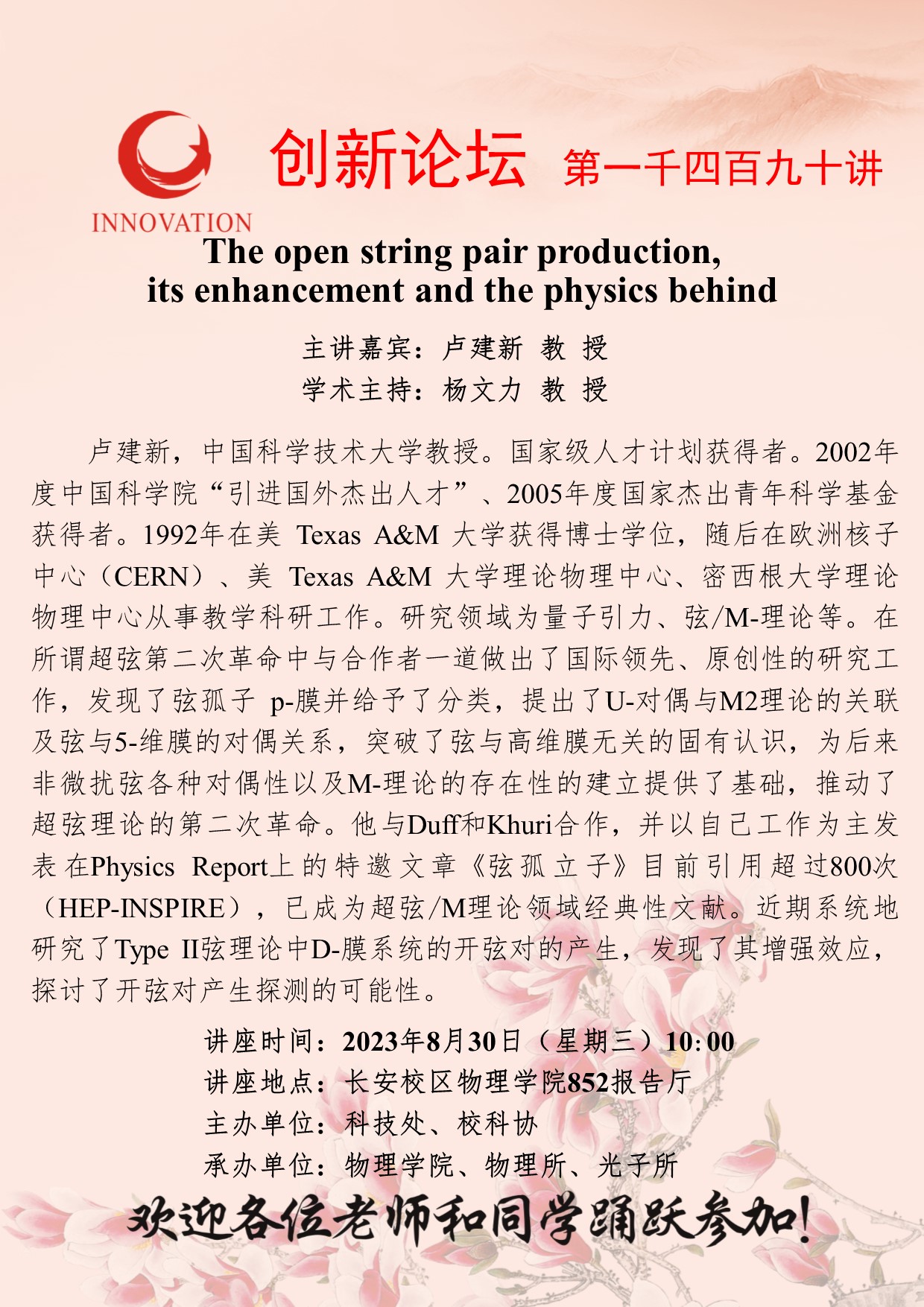 卢建新 教授 bat365正版唯一官网创新论坛第一千四百九十讲:The open string pair production, its enhancement and the physics behind 讲座时间 2023年8月30日(星期三)10:00 讲座地点 长安校区物理学院852报告厅 讲座人介绍 卢建新 教授 讲座内容