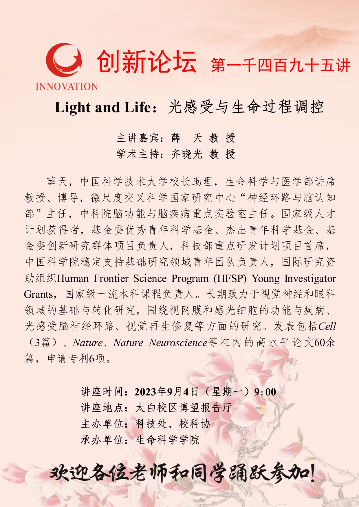 薛天 教授 bat365正版唯一官网创新论坛第一千四百九十五讲:Light and Life:光感受与生命过程调控 讲座时间 2023年9月4日(星期一)9:00 讲座地点 太白校区博望报告厅 讲座人介绍 薛天 教授 讲座内容