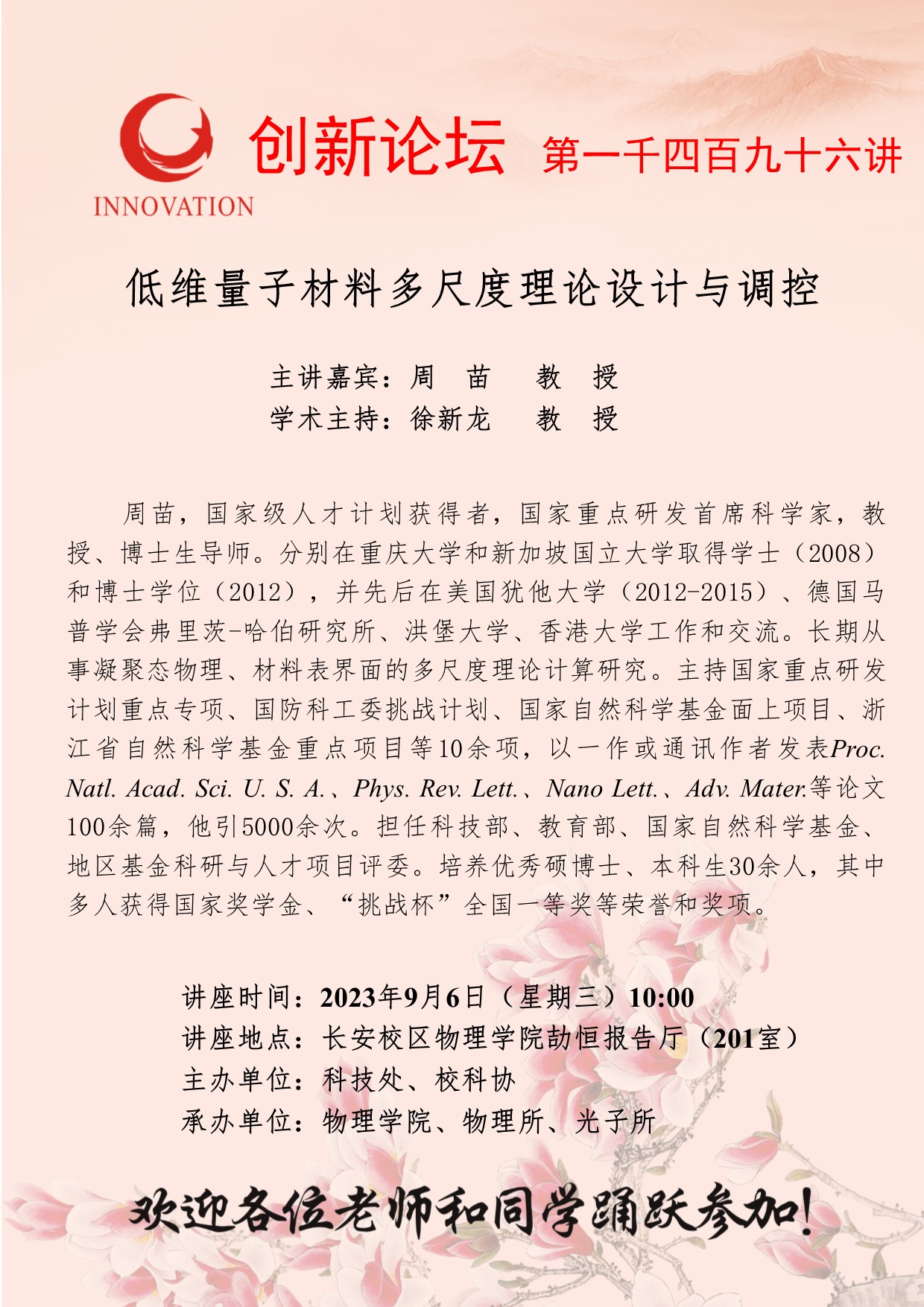 周苗 教授 bat365正版唯一官网创新论坛第一千四百九十六讲:低维量子材料多尺度理论设计与调控 讲座时间 2023年9月6日(星期三)10:00 讲座地点 长安校区物理学院劼恒报告厅(201室) 讲座人介绍 周苗 教授 讲座内容
