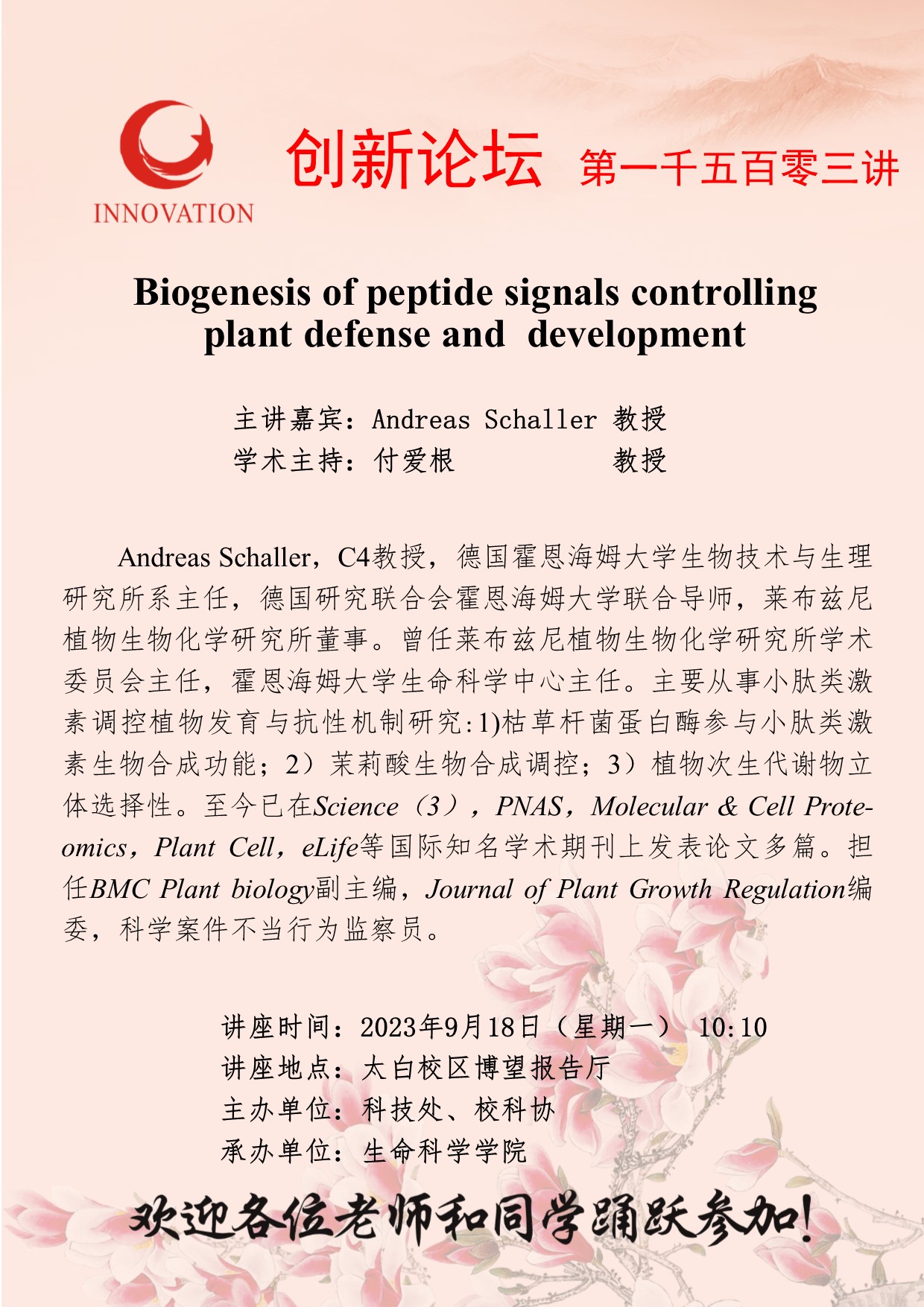 Andreas Schaller 教授 bat365正版唯一官网创新论坛第一千五百零三讲:Biogenesis of peptide signals controlling plant defense and development 讲座时间 2023年9月18日(星期一) 10:10 讲座地点 太白校区博望报告厅 讲座人介绍 Andreas Schaller 教授 讲座内容