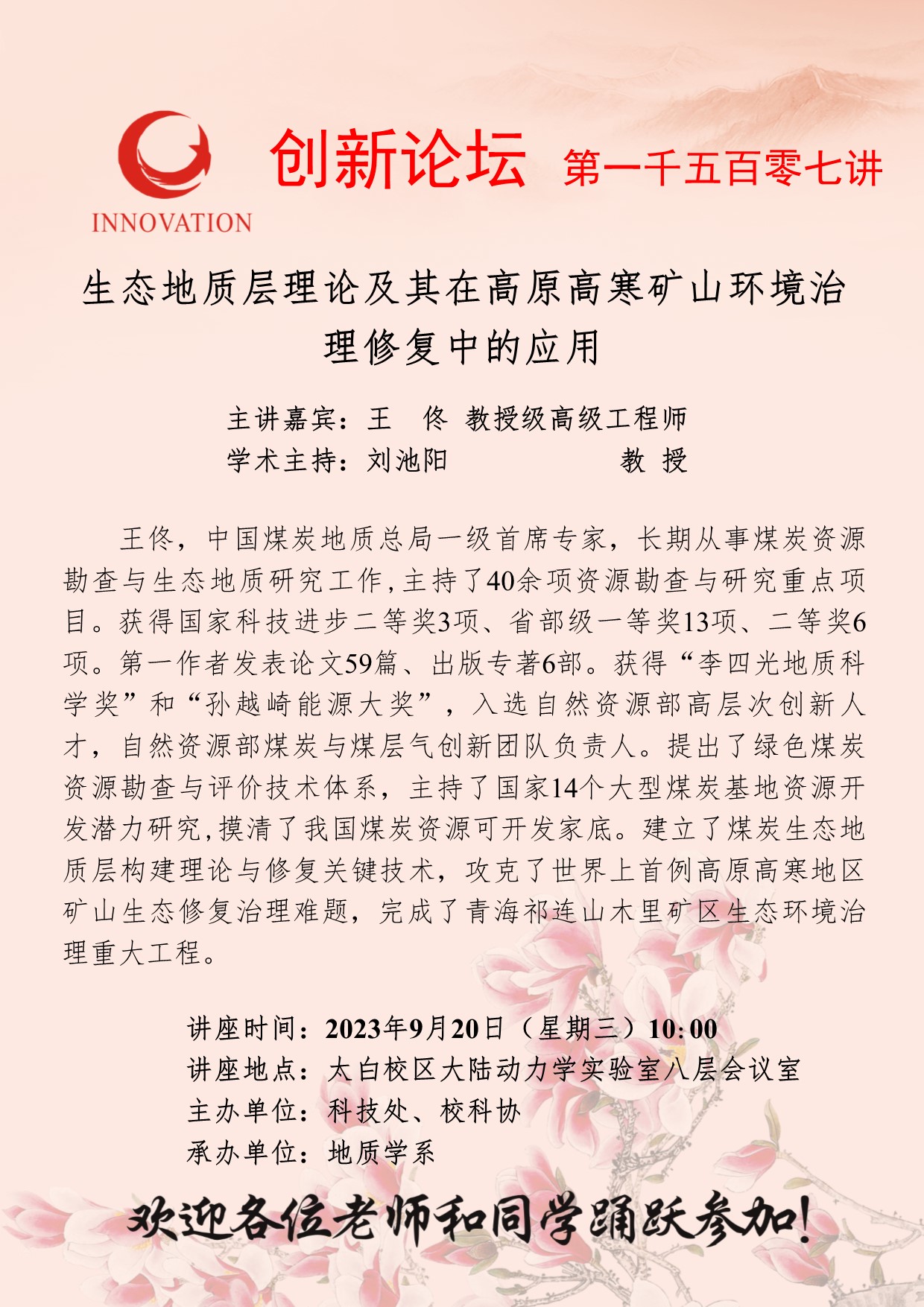 王佟 教授级高级工程师 bat365正版唯一官网创新论坛第一千五百零七讲:生态地质层理论及其在高原高寒矿山环境治理修复中的应用 讲座时间 2023年9月20日(星期三)10:00 讲座地点 太白校区大陆动力学实验室八层会议室 讲座人介绍 王佟 教授级高级工程师 讲座内容