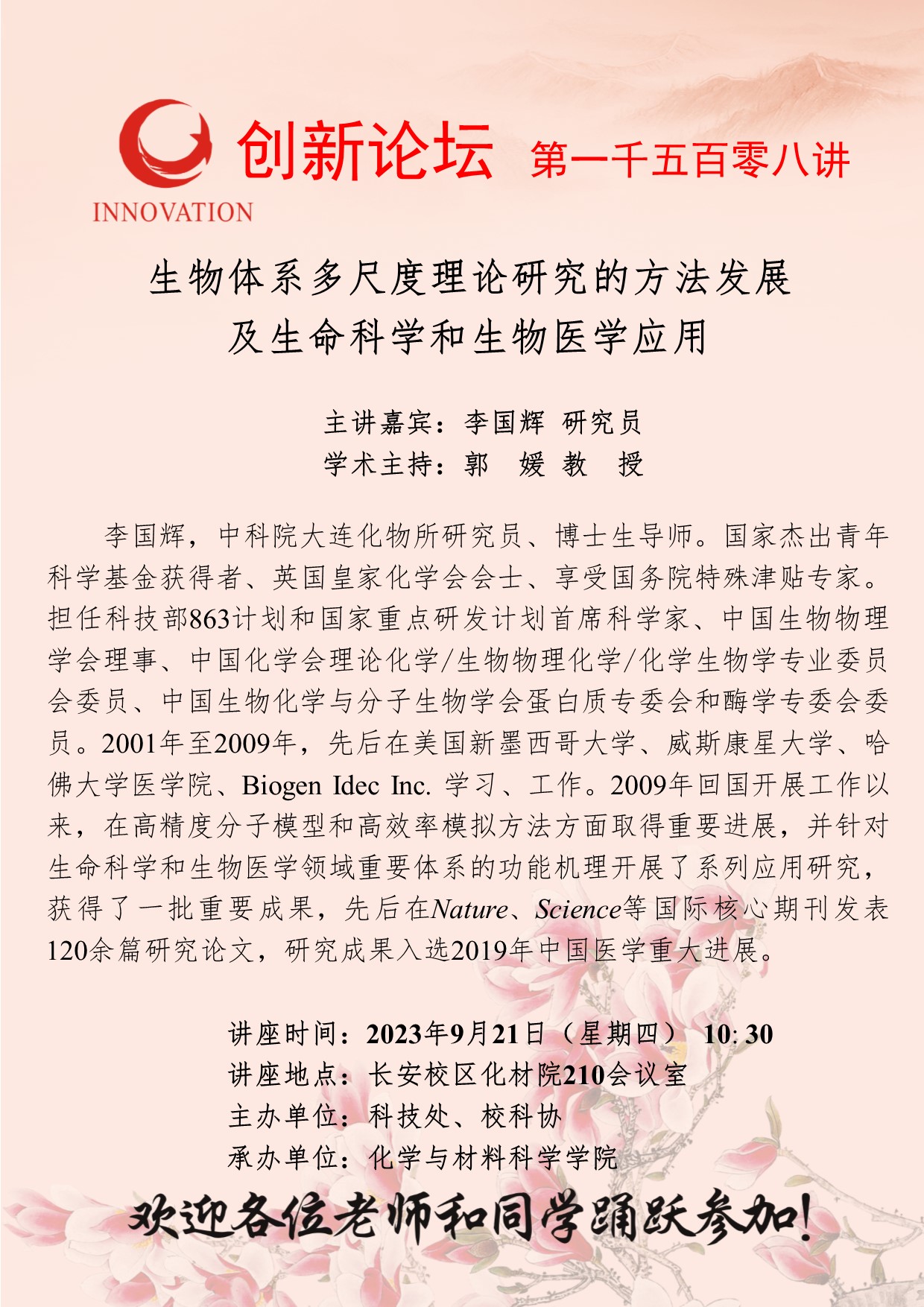 李国辉 研究员 bat365正版唯一官网创新论坛第一千五百零八讲:生物体系多尺度理论研究的方法发展及生命科学和生物医学应用 讲座时间 2023年9月21日(星期四) 10: 30 讲座地点 长安校区化材院210会议室 讲座人介绍 李国辉 研究员 讲座内容
