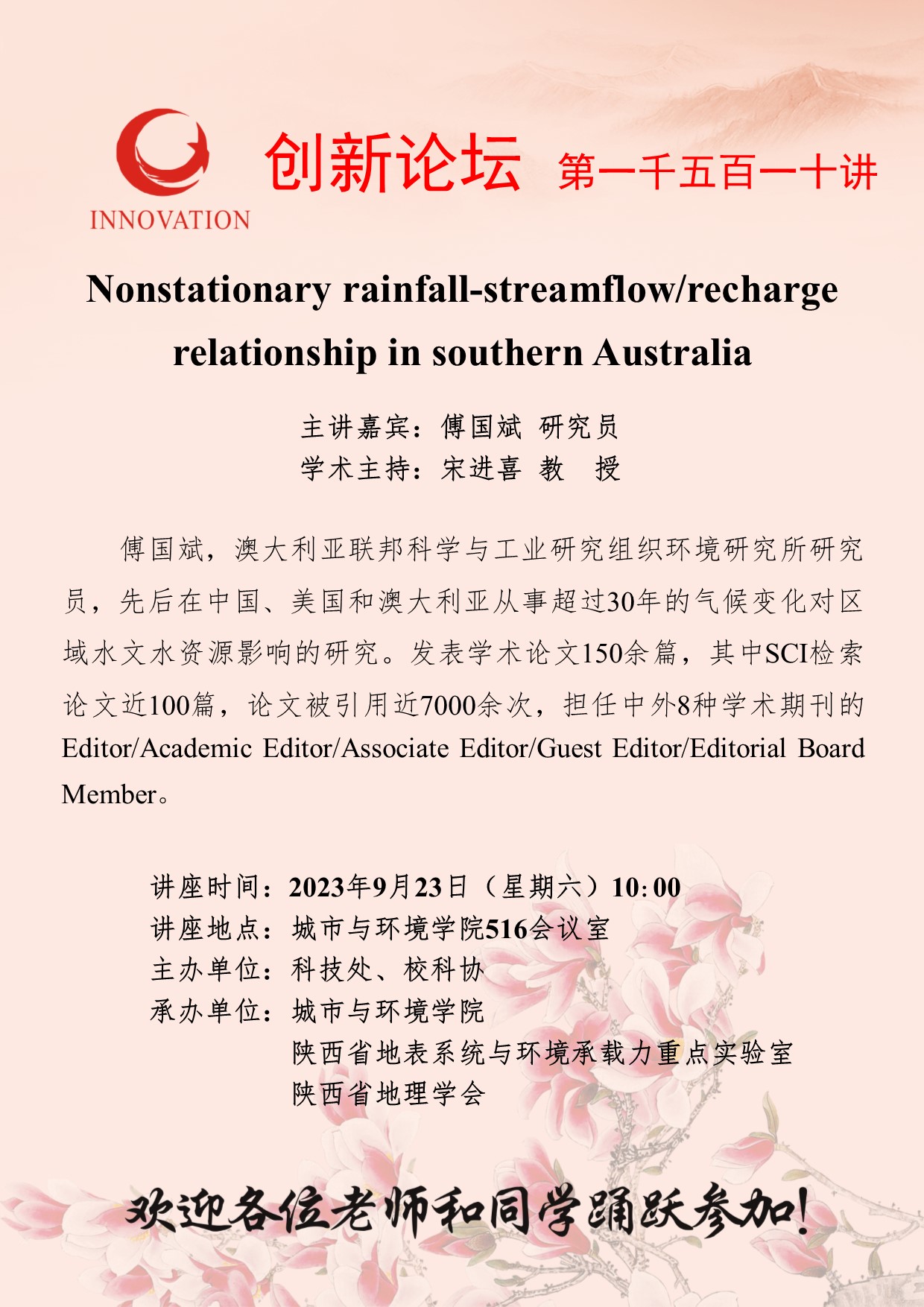 傅国斌 研究员 bat365正版唯一官网创新论坛第一千五百一十讲:Nonstationary rainfall‐streamflow/recharge relationship in southern Australia 讲座时间 2023年9月23日(星期六)10:00 讲座地点 城市与环境学院516会议室 讲座人介绍 傅国斌 研究员 讲座内容