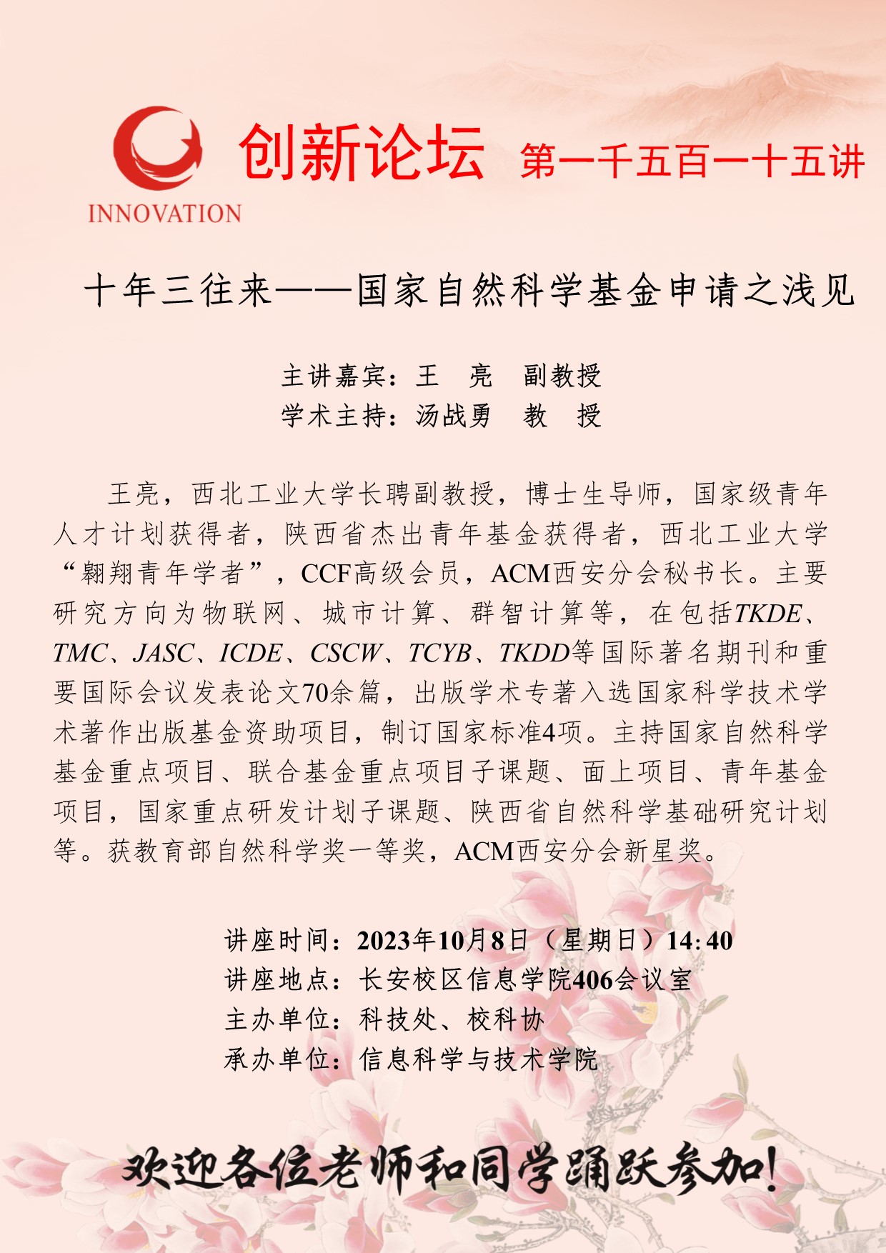 王亮 副教授 bat365正版唯一官网创新论坛第一千五百一十五讲: 十年三往来——国家自然科学基金申请之浅见 讲座时间 2023年10月8日(星期日)14:40 讲座地点 长安校区信息学院406会议室 讲座人介绍 王亮 副教授 讲座内容