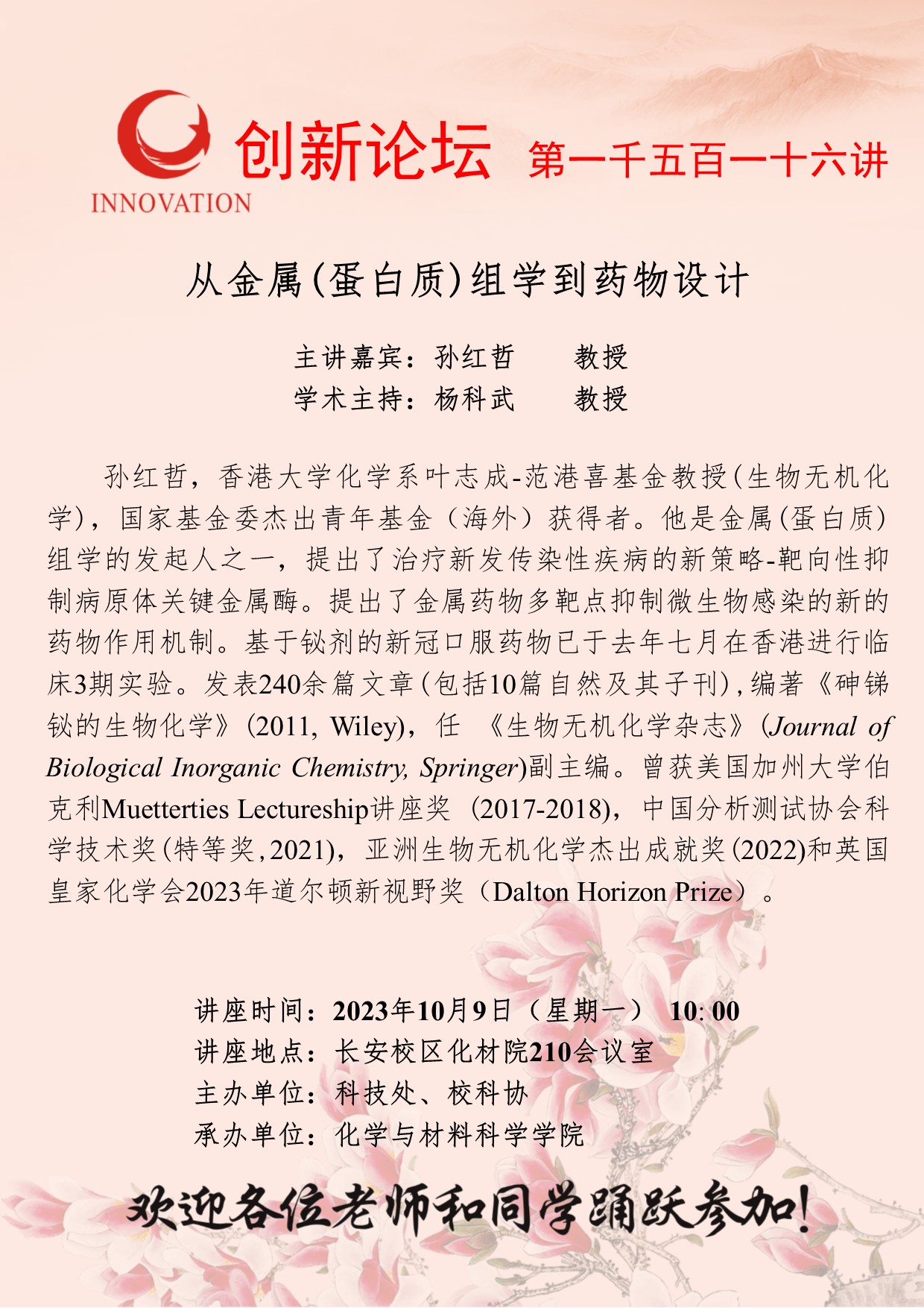 孙红哲 教授 bat365正版唯一官网创新论坛第一千五百一十六讲:从金属(蛋白质)组学到药物设计 讲座时间 2023年10月9日(星期一) 10: 00 讲座地点 长安校区化材院210会议室 讲座人介绍 孙红哲 教授 讲座内容