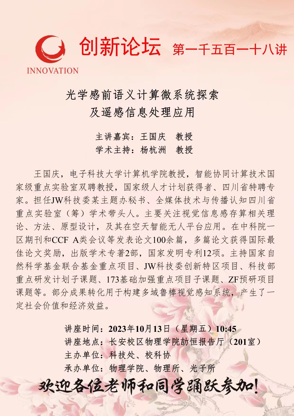 王国庆 教授 bat365正版唯一官网创新论坛第一千五百一十八讲:光学感前语义计算微系统探索及遥感信息处理应用 讲座时间 2023年10月13日(星期五)10:45 讲座地点 长安校区物理学院劼恒报告厅(201室) 讲座人介绍 王国庆 教授 讲座内容