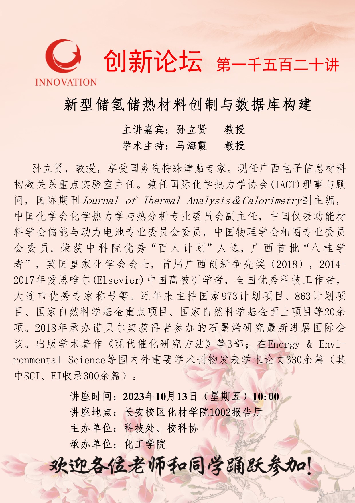 孙立贤 教授 bat365正版唯一官网创新论坛第一千五百二十讲:新型储氢储热材料创制与数据库构建 讲座时间 2023年10月13日(星期五)10:00 讲座地点 长安校区化材学院1002报告厅 讲座人介绍 孙立贤 教授 讲座内容