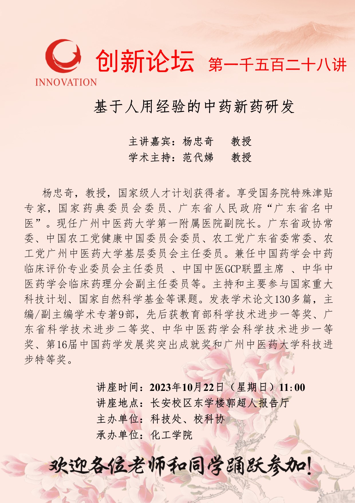 杨忠奇 教授 bat365正版唯一官网创新论坛第一千五百二十八讲:基于人用经验的中药新药研发 讲座时间 2023年10月22日(星期日)11:00 讲座地点 长安校区东学楼郭超人报告厅 讲座人介绍 杨忠奇 教授 讲座内容