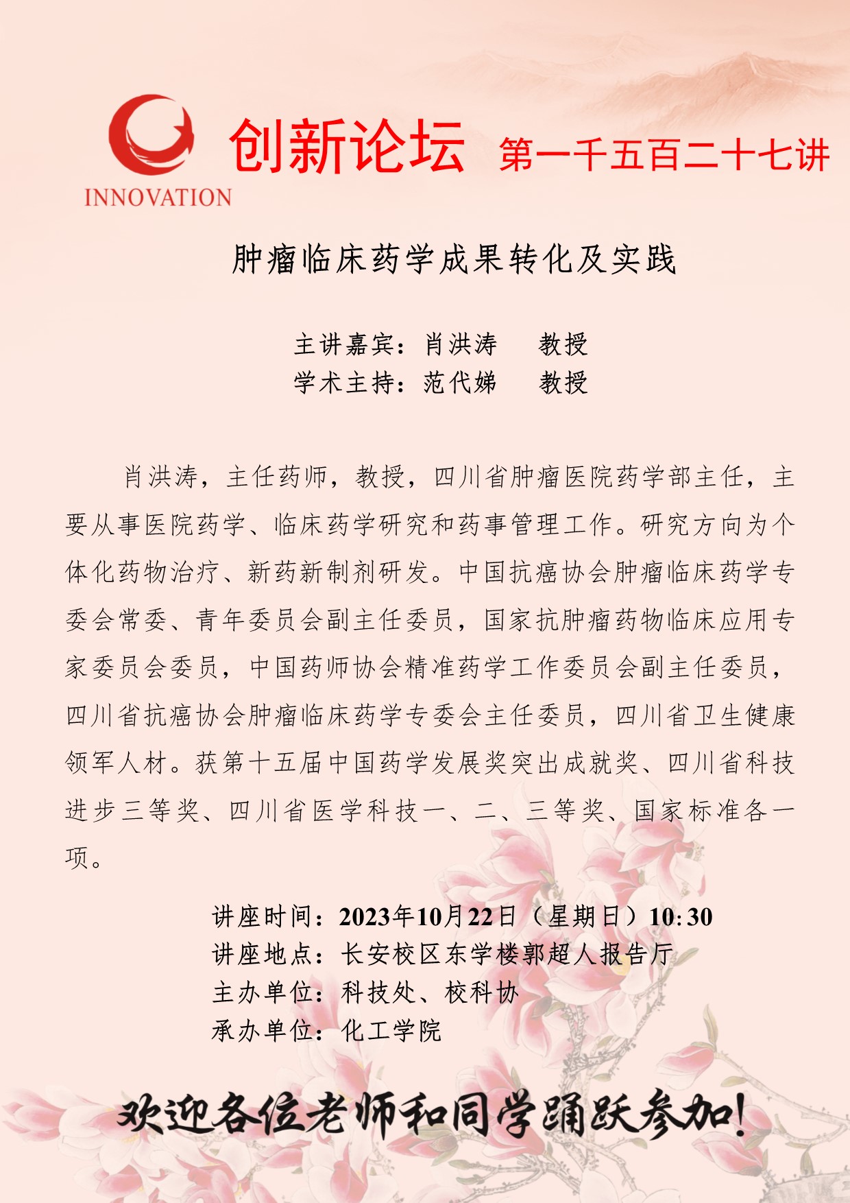 肖洪涛 教授 bat365正版唯一官网创新论坛第一千五百二十七讲:肿瘤临床药学成果转化及实践 讲座时间 2023年10月22日(星期日)10:30 讲座地点 长安校区东学楼郭超人报告厅 讲座人介绍 肖洪涛 教授 讲座内容