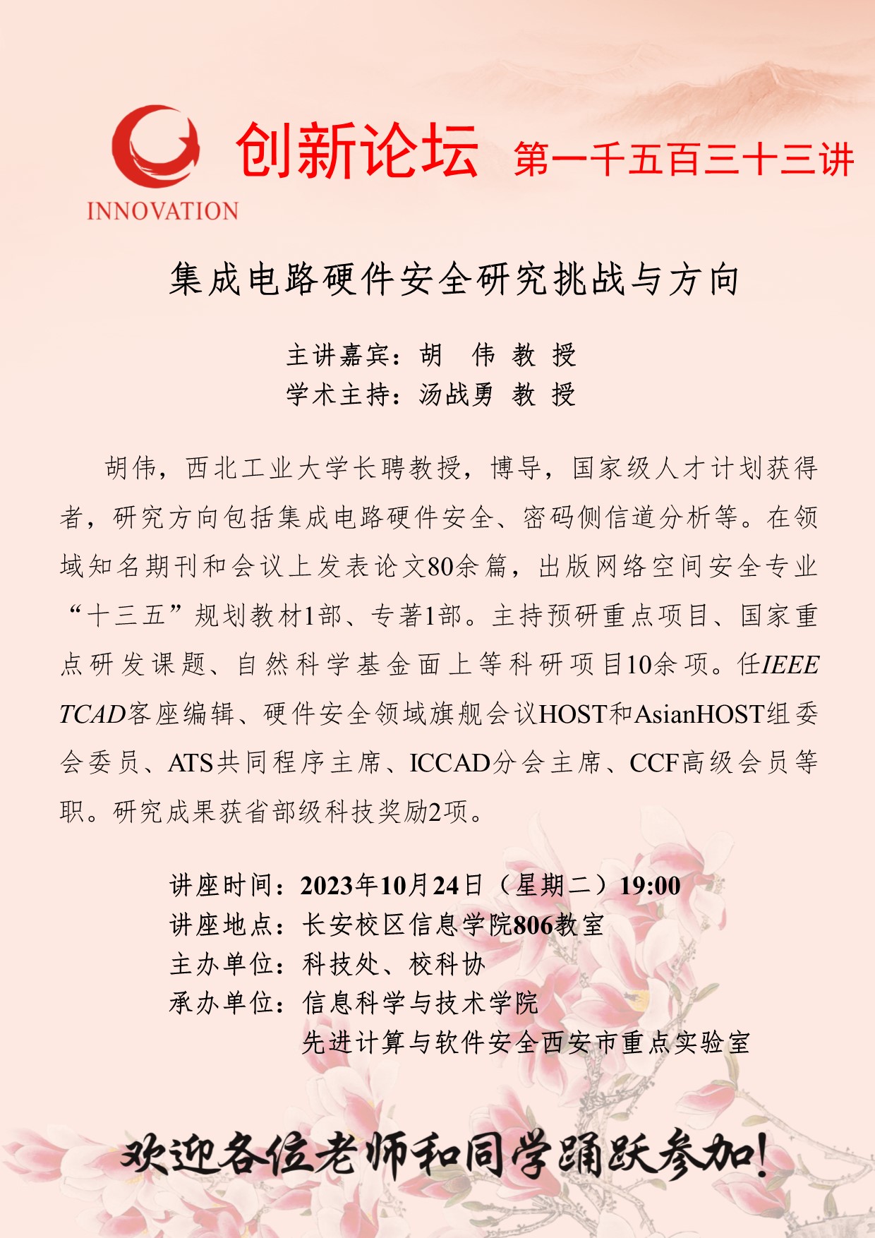 胡 伟 教授 bat365正版唯一官网创新论坛第一千五百三十三讲:集成电路硬件安全研究挑战与方向 讲座时间 2023年10月24日(星期二)19:00 讲座地点 长安校区信息学院806教室 讲座人介绍 胡 伟 教授 讲座内容