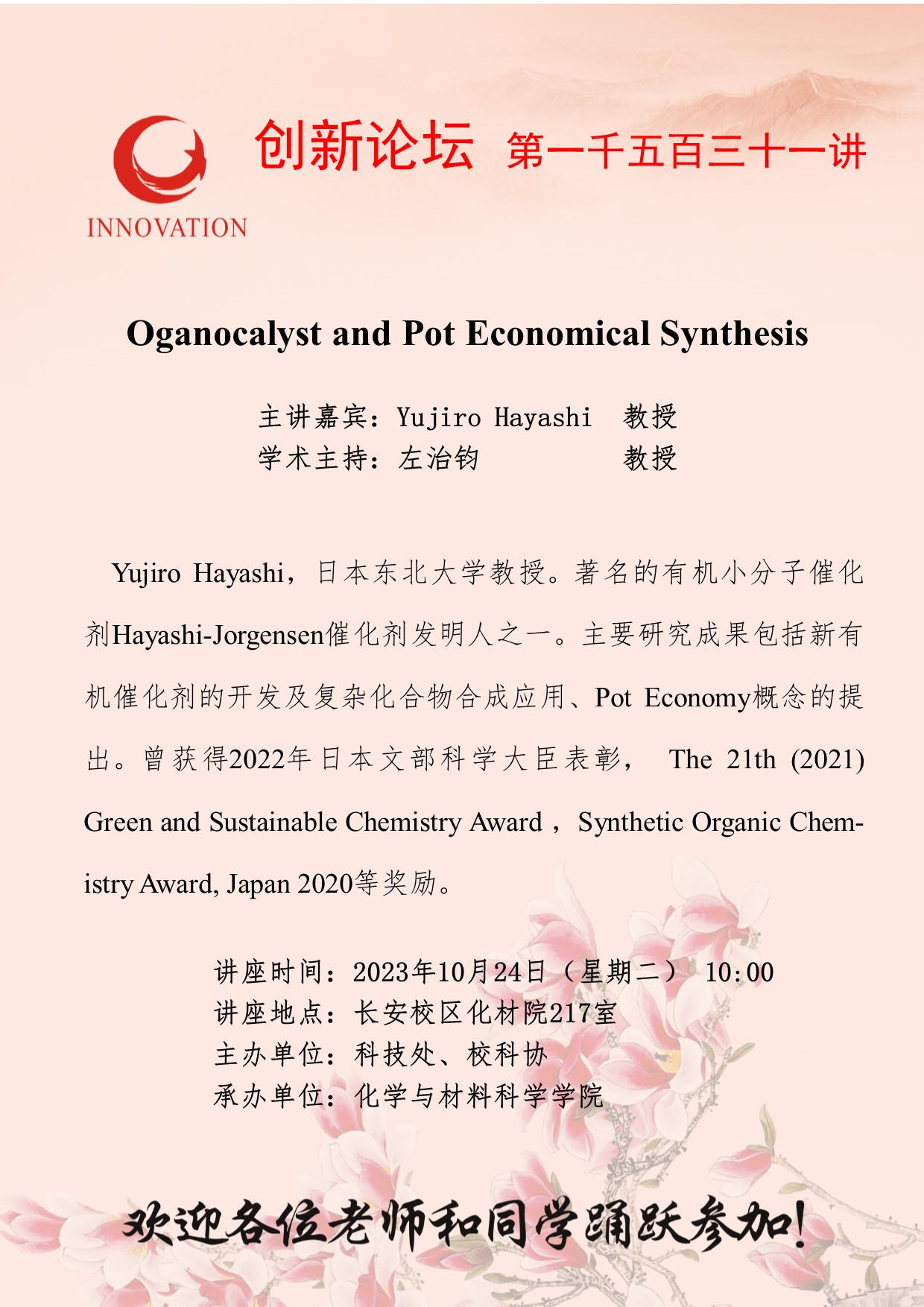 Yujiro Hayashi 教授 bat365正版唯一官网创新论坛第一千五百三十一讲:Oganocalyst and Pot Economical Synthesis 讲座时间 2023年10月24日(星期二) 10:00 讲座地点 长安校区化材院217室 讲座人介绍 Yujiro Hayashi 教授 讲座内容