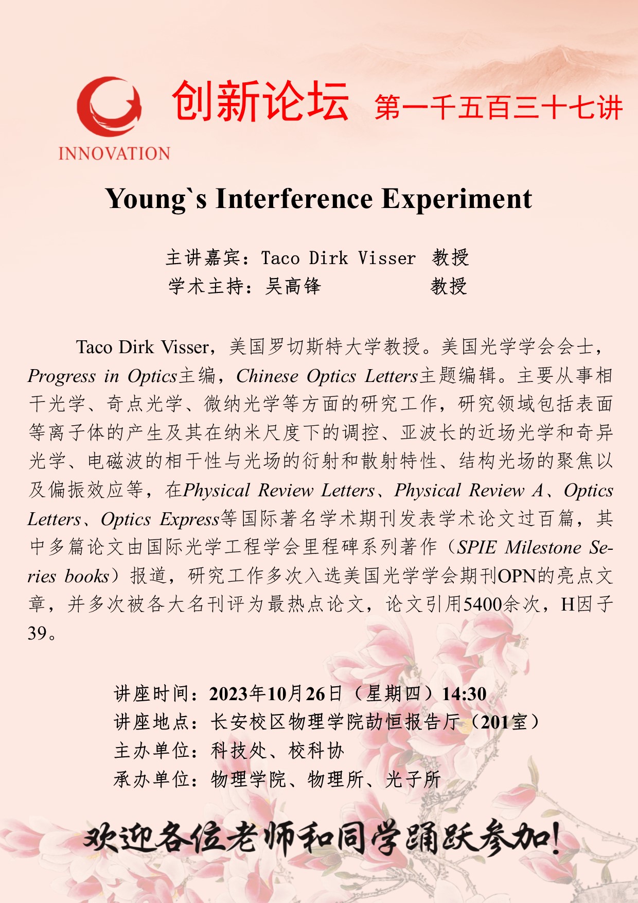 Taco Dirk Visser 教授 bat365正版唯一官网创新论坛第一千五百三十七讲:Young`s Interference Experiment 讲座时间 2023年10月26日(星期四)14:30 讲座地点 长安校区物理学院劼恒报告厅(201室) 讲座人介绍 Taco Dirk Visser 教授 讲座内容
