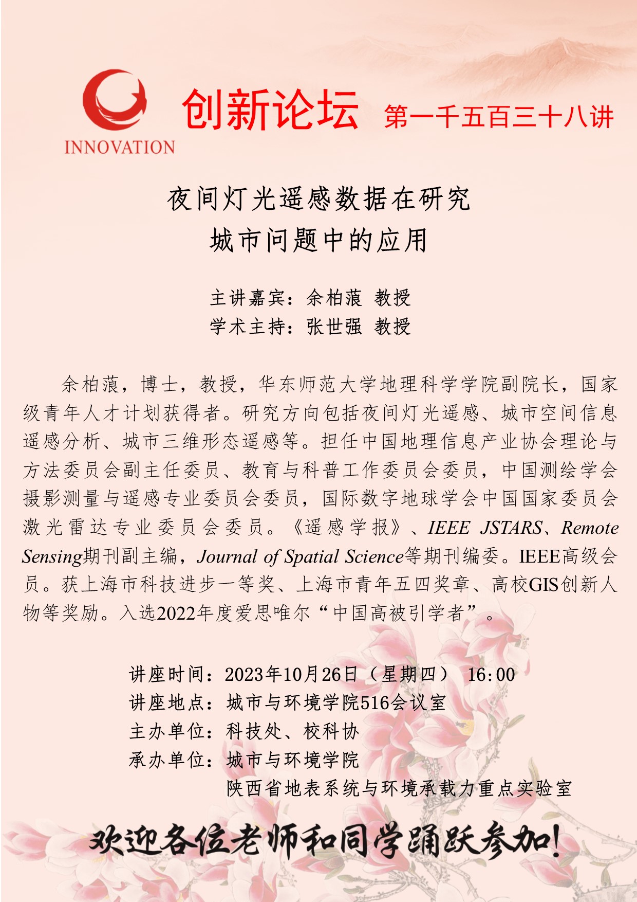 余柏蒗 教授 bat365正版唯一官网创新论坛第一千五百三十八讲:夜间灯光遥感数据在研究城市问题中的应用 讲座时间 2023年10月26日(星期四) 16:00 讲座地点 城市与环境学院516会议室 讲座人介绍 余柏蒗 教授 讲座内容