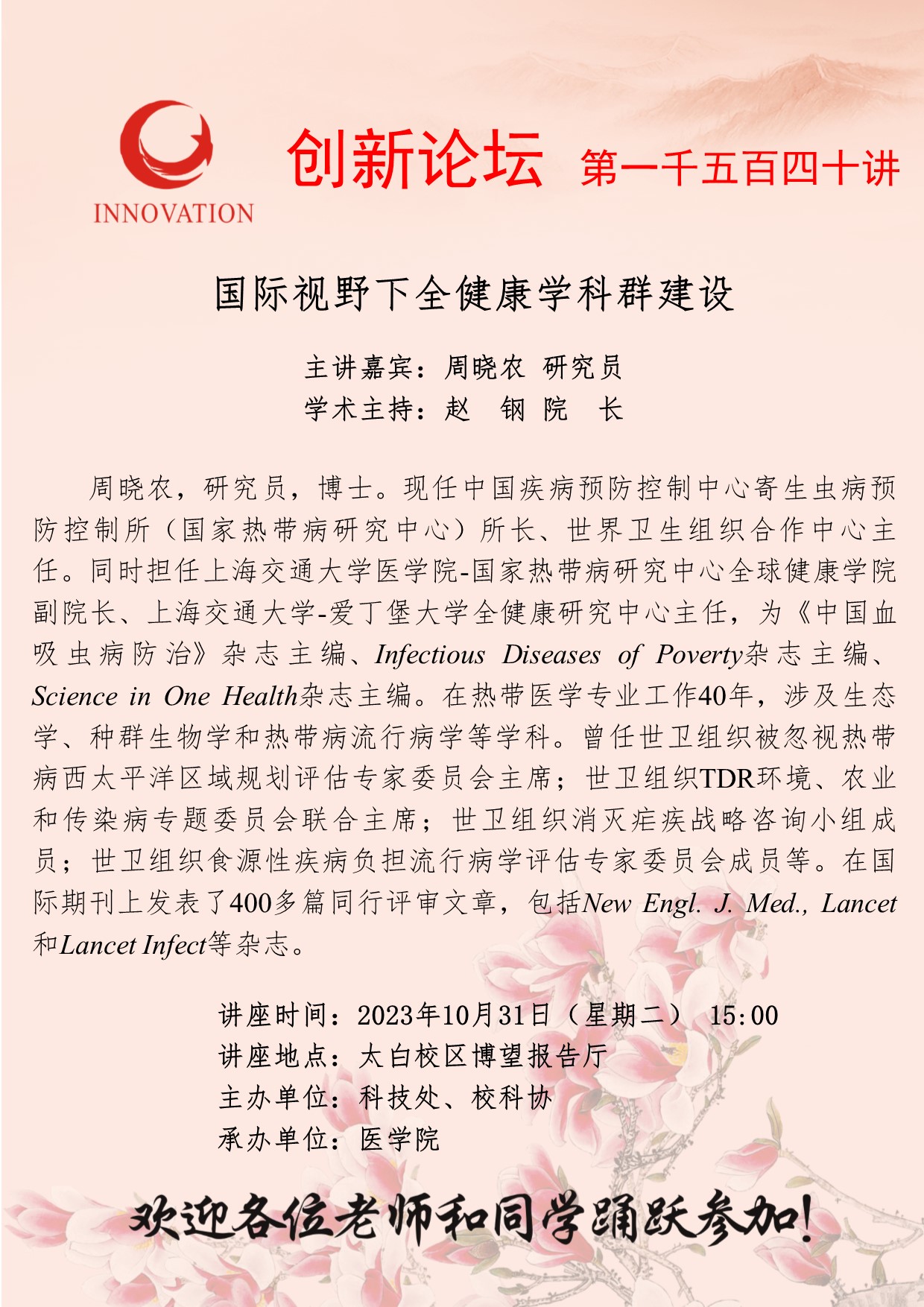 周晓农 研究员 bat365正版唯一官网创新论坛第一千五百四十讲:国际视野下全健康学科群建设 讲座时间 2023年10月31日(星期二) 15:00 讲座地点 太白校区博望报告厅 讲座人介绍 周晓农 研究员 讲座内容