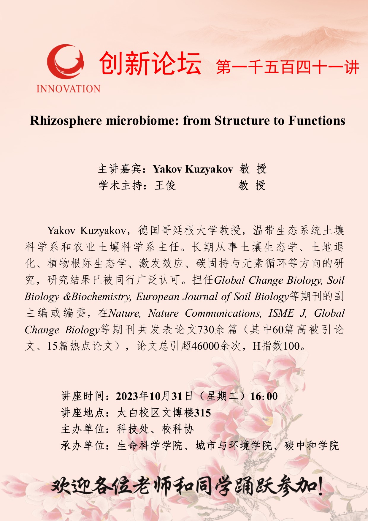 Yakov Kuzyakov 教 授 bat365正版唯一官网创新论坛第一千五百四十一讲:Rhizosphere microbiome: from Structure to Functions 讲座时间 2023年10月31日(星期二)16:00 讲座地点 太白校区文博楼315 讲座人介绍 Yakov Kuzyakov 教 授 讲座内容