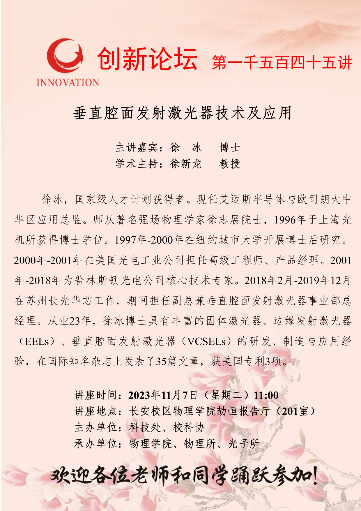 徐冰 博士 bat365正版唯一官网创新论坛第一千五百四十五讲:垂直腔面发射激光器技术及应用 讲座时间 2023年11月7日(星期二)11:00 讲座地点 长安校区物理学院劼恒报告厅(201室) 讲座人介绍 徐冰 博士 讲座内容