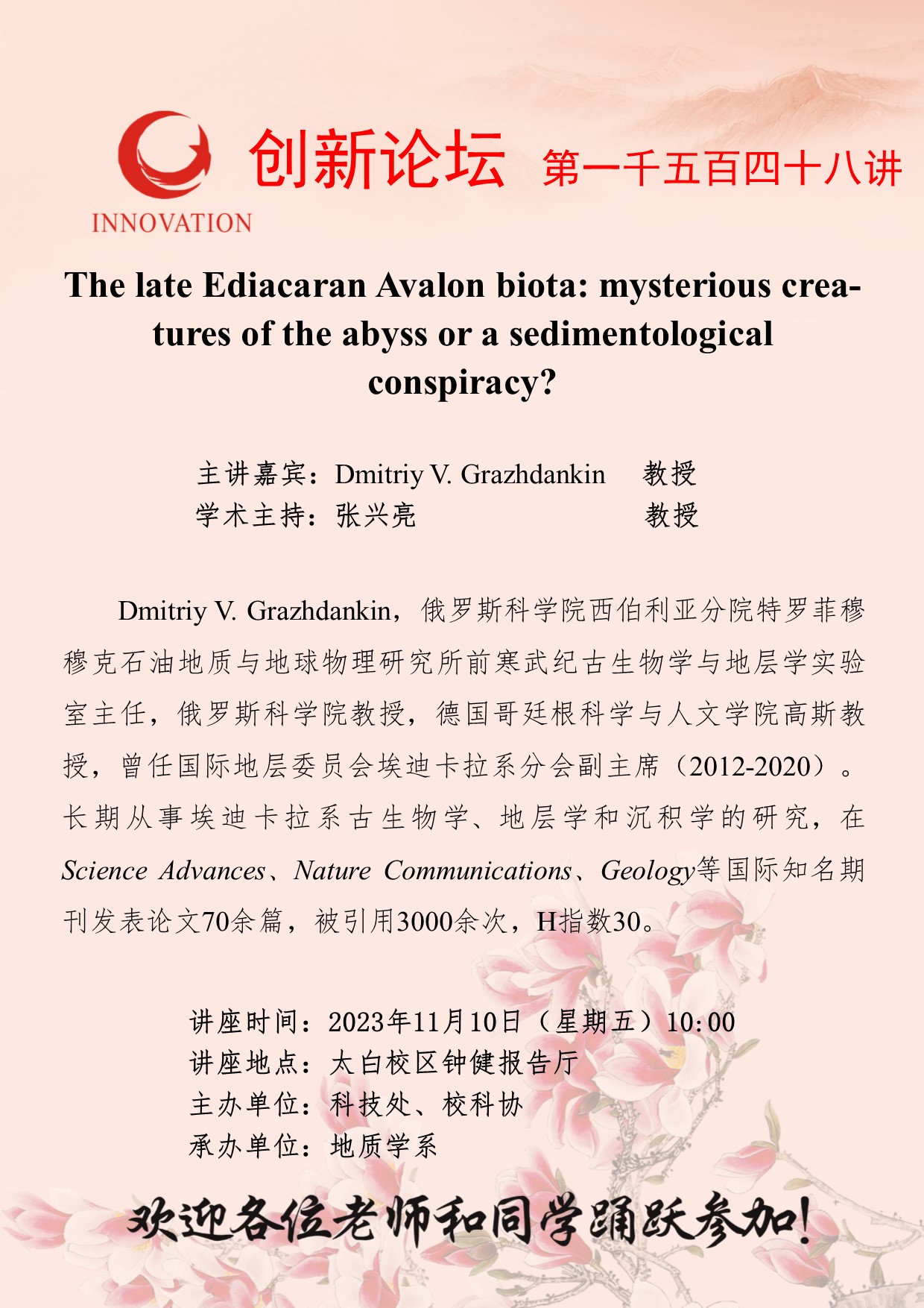Dmitriy V. Grazhdankin 教授 bat365正版唯一官网创新论坛第一千五百四十八讲:The late Ediacaran Avalon biota: mysterious creatures of the abyss or a sedimentological conspiracy? 讲座时间 2023年11月10日(星期五)10:00 讲座地点 太白校区钟健报告厅 讲座人介绍 Dmitriy V. Grazhdankin 教授 讲座内容