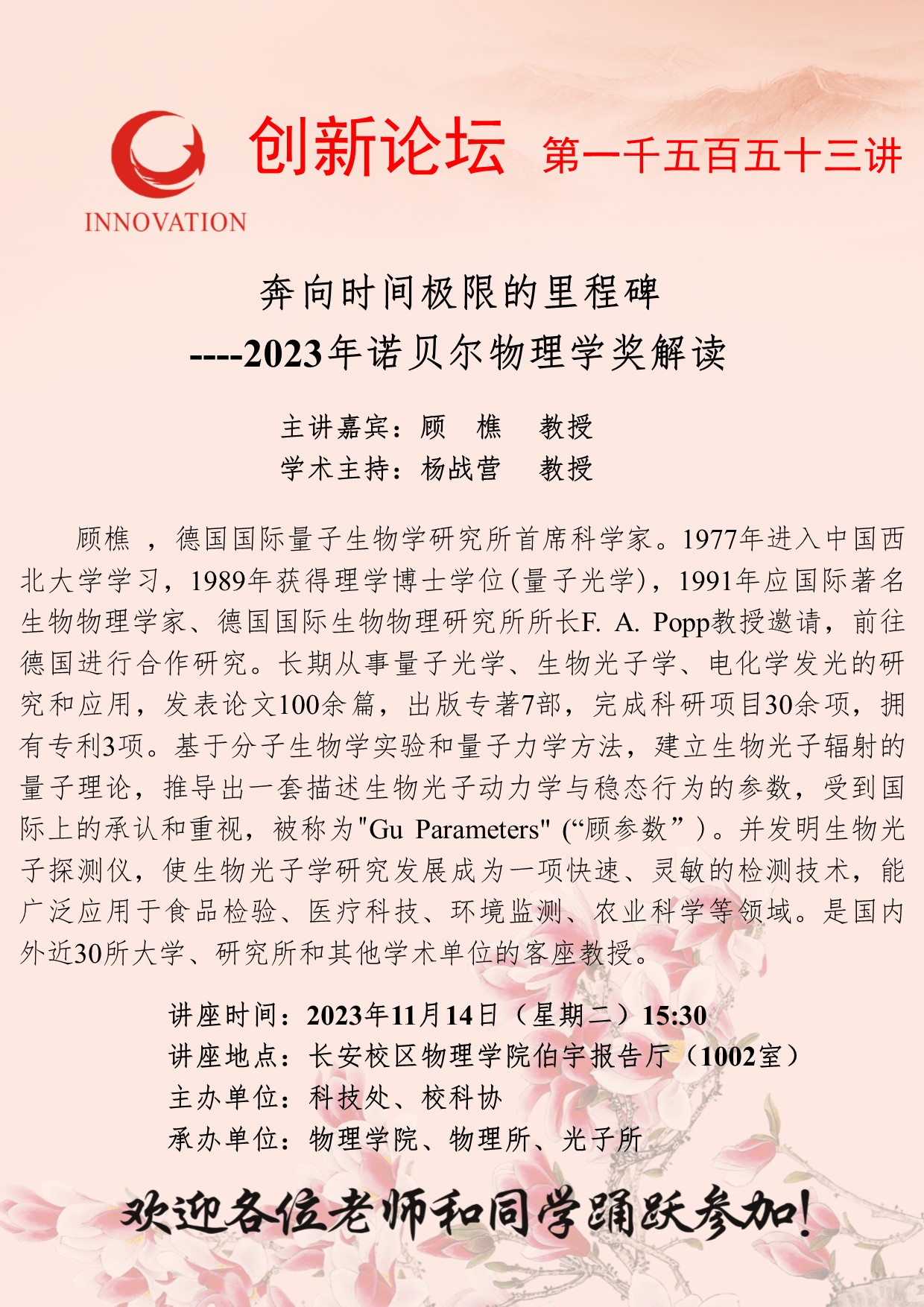 顾樵 教授 bat365正版唯一官网创新论坛第一千五百五十三讲:奔向时间极限的里程碑----2023年诺贝尔物理学奖解读 讲座时间 2023年11月14日(星期二)15:30 讲座地点 长安校区物理学院伯宇报告厅(1002室) 讲座人介绍 顾樵 教授 讲座内容