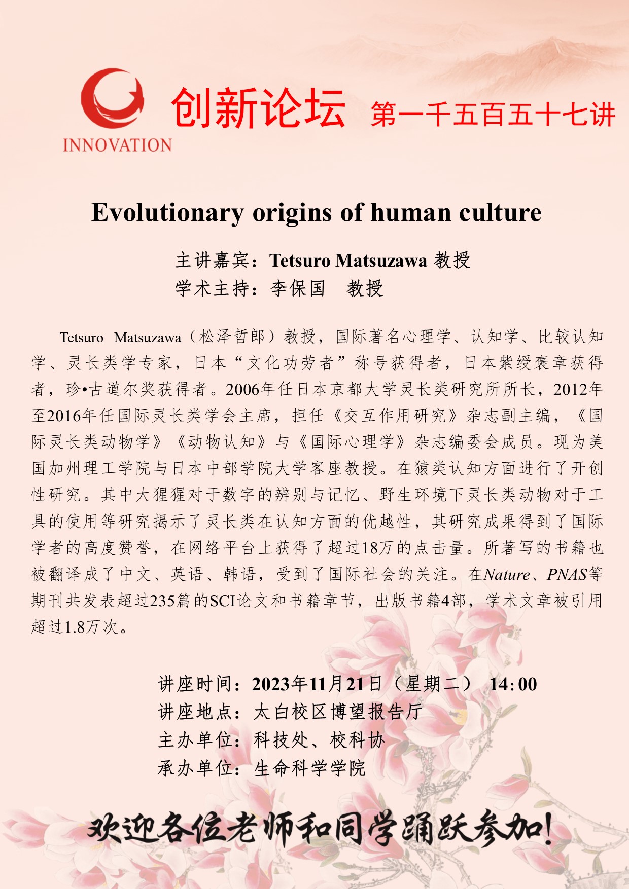 Tetsuro Matsuzawa 教授 bat365正版唯一官网创新论坛第一千五百五十七讲:Evolutionary origins of human culture 讲座时间 2023年11月21日(星期二) 14:00 讲座地点 太白校区博望报告厅 讲座人介绍 Tetsuro Matsuzawa 教授 讲座内容