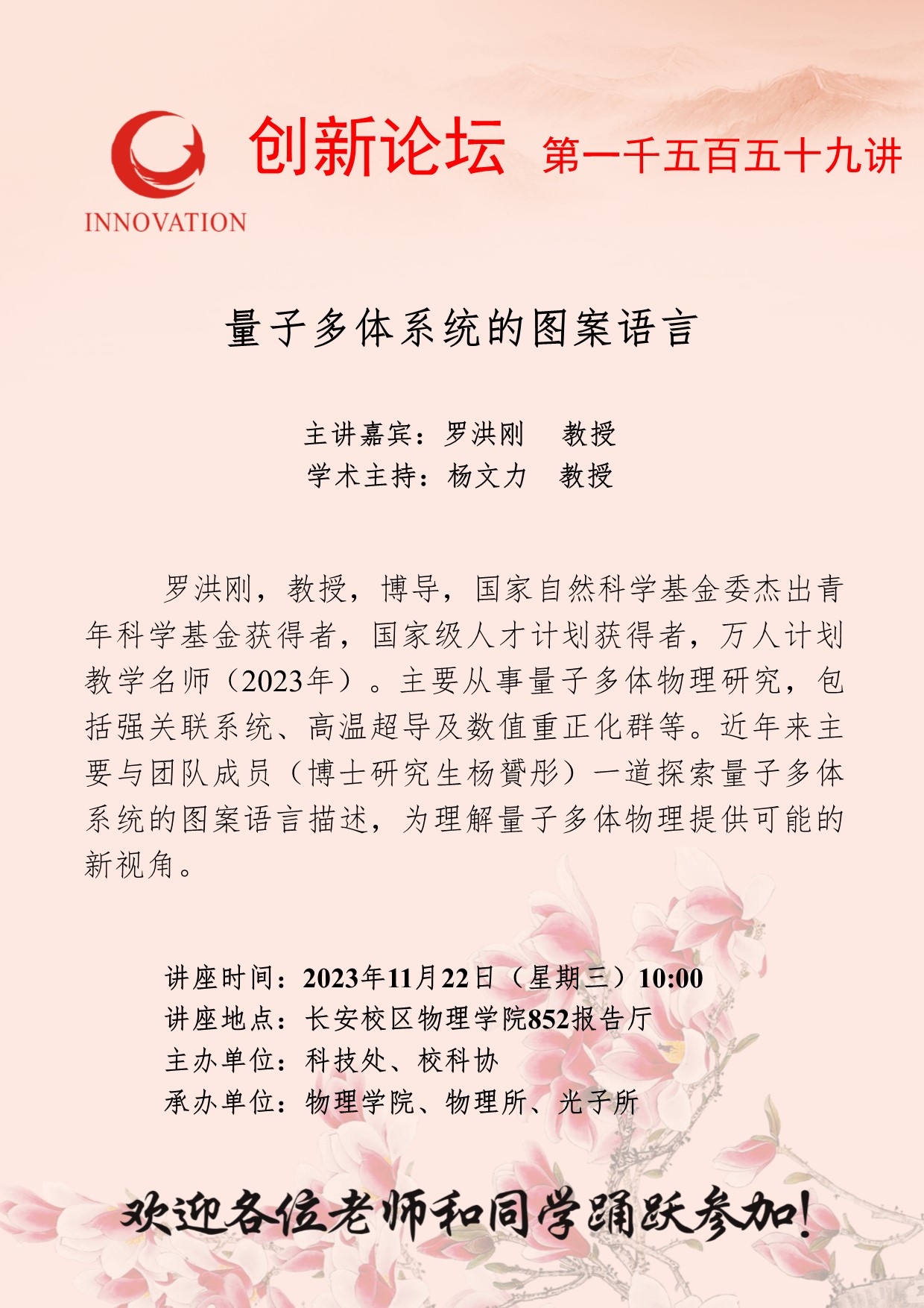 罗洪刚 教授 bat365正版唯一官网创新论坛第一千五百五十九讲:量子多体系统的图案语言 讲座时间 2023年11月22日(星期三)10:00 讲座地点 长安校区物理学院852报告厅 讲座人介绍 罗洪刚 教授 讲座内容