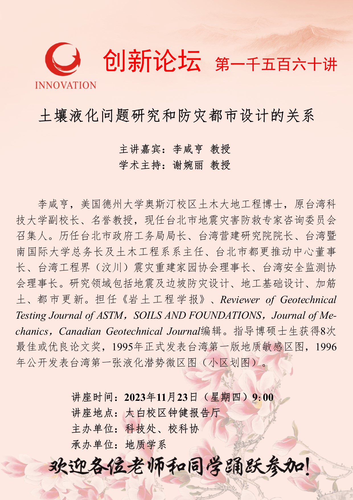 李咸亨 教授 bat365正版唯一官网创新论坛第一千五百六十讲:土壤液化问题研究和防灾都市设计的关系 讲座时间 2023年11月23日(星期四)9:00 讲座地点 太白校区钟健报告厅 讲座人介绍 李咸亨 教授 讲座内容