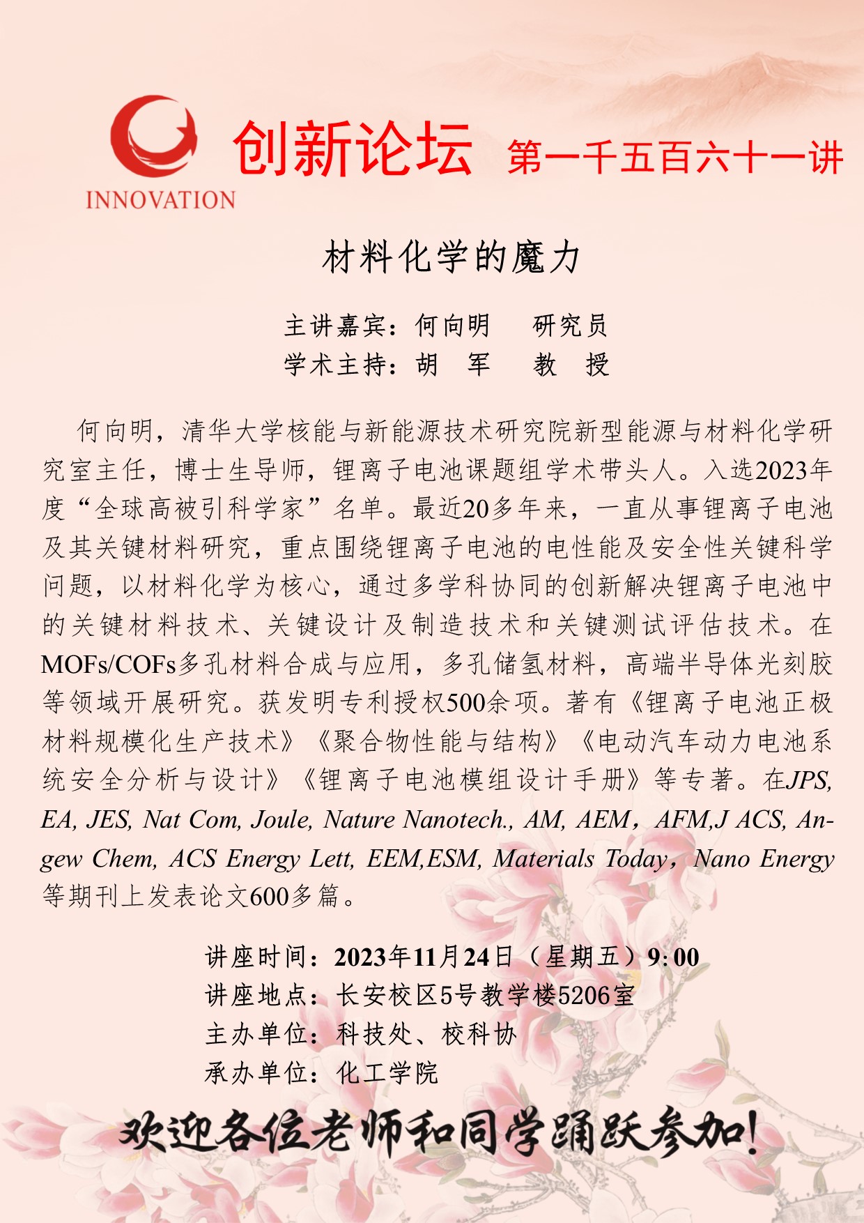 何向明 研究员 bat365正版唯一官网创新论坛第一千五百六十一讲:材料化学的魔力 讲座时间 2023年11月24日(星期五)9:00 讲座地点 长安校区5号教学楼5206室 讲座人介绍 何向明 研究员 讲座内容