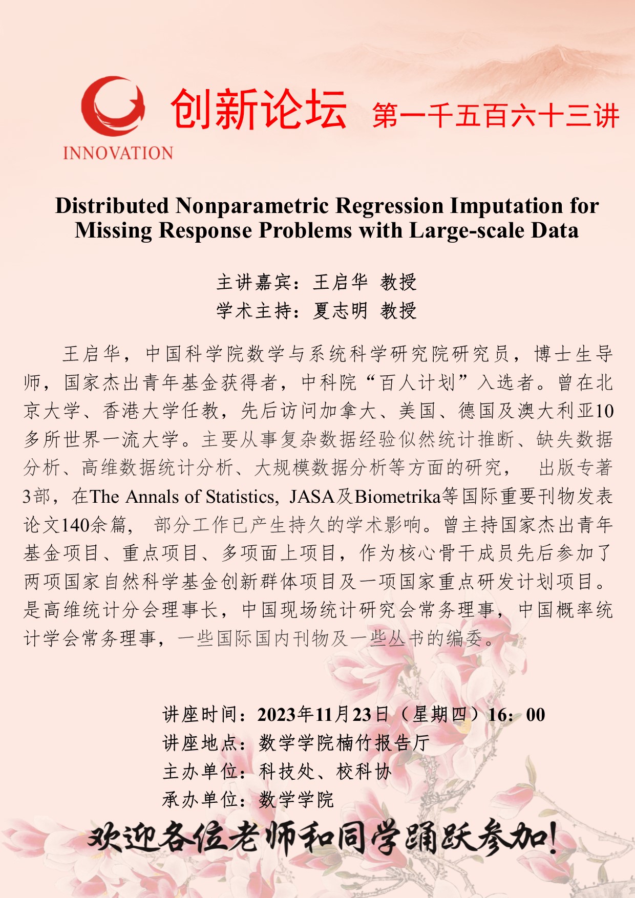 王启华 教授 bat365正版唯一官网创新论坛第一千五百六十三讲:Distributed Nonparametric Regression Imputation for Missing Response Problems with Large-scale Data 讲座时间 2023年11月23日(周四)16:00 讲座地点 数学学院楠竹报告厅 讲座人介绍 王启华 教授 讲座内容
