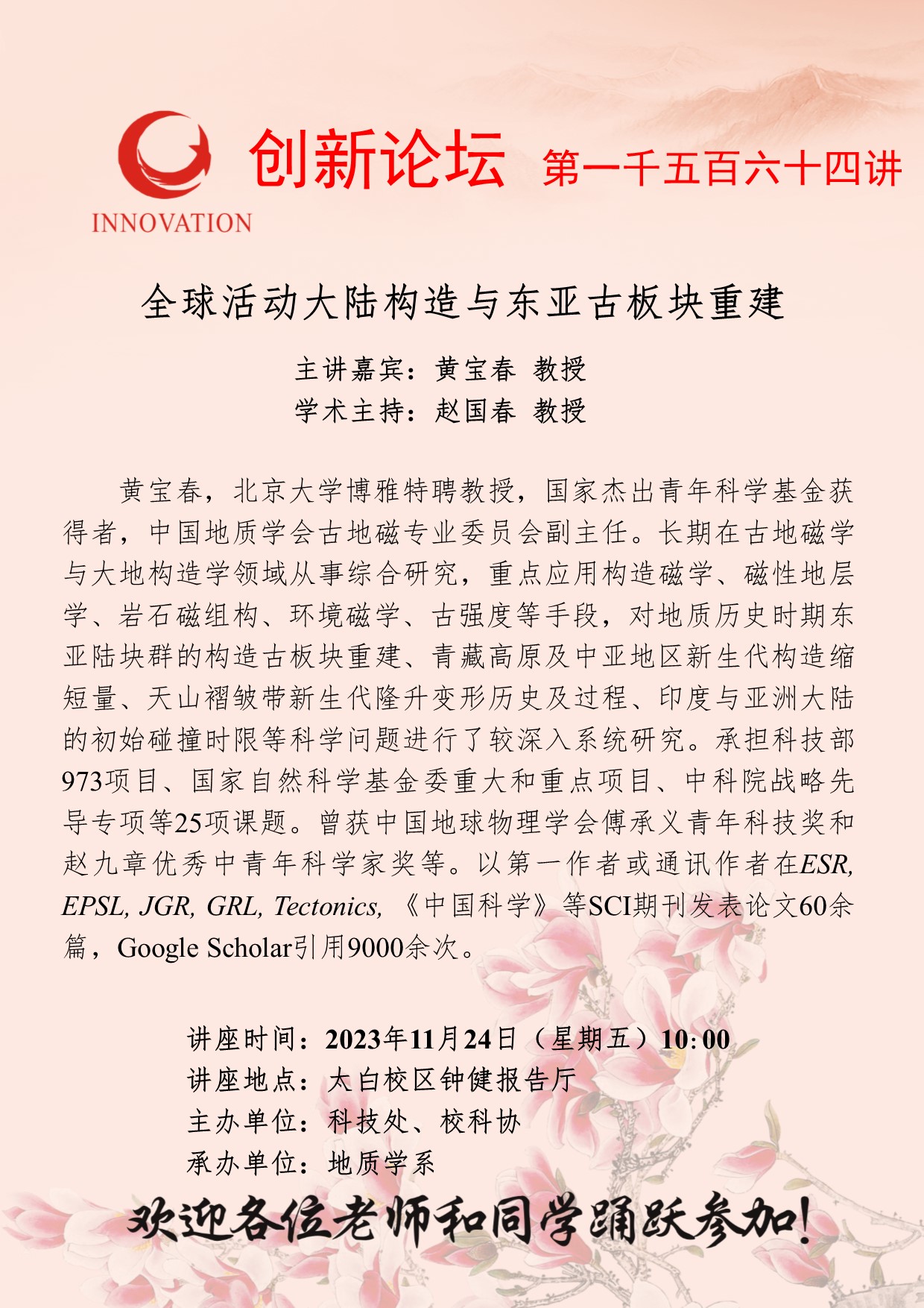 黄宝春 教授 bat365正版唯一官网创新论坛第一千五百六十四讲:全球活动大陆构造与东亚古板块重建 讲座时间 2023年11月24日(星期五)10:00 讲座地点 太白校区钟健报告厅 讲座人介绍 黄宝春 教授 讲座内容