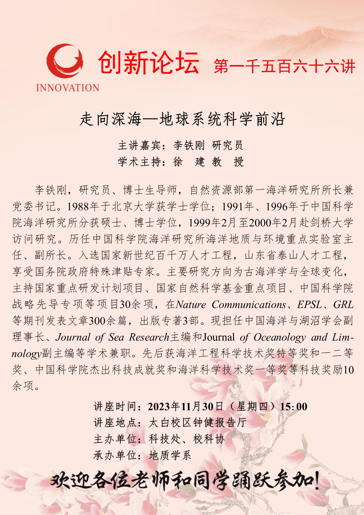 李铁刚 研究员 bat365正版唯一官网创新论坛第一千五百六十六讲:走向深海—地球系统科学前沿 讲座时间 2023年11月30日(星期四)15:00 讲座地点 太白校区钟健报告厅 讲座人介绍 李铁刚 研究员 讲座内容