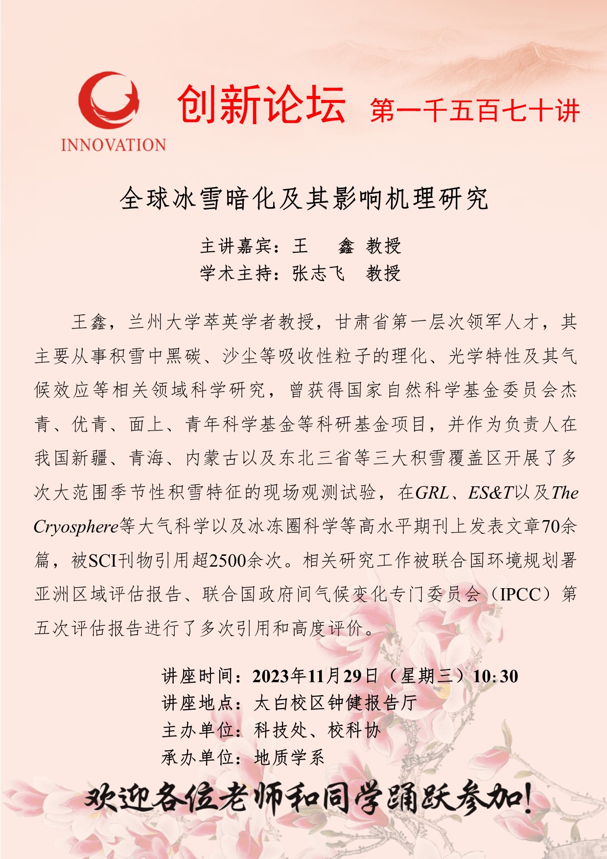 王鑫 教授 bat365正版唯一官网创新论坛第一千五百七十讲:全球冰雪暗化及其影响机理研究 讲座时间 2023年11月29日(星期三)10:30 讲座地点 太白校区钟健报告厅 讲座人介绍 王鑫 教授 讲座内容