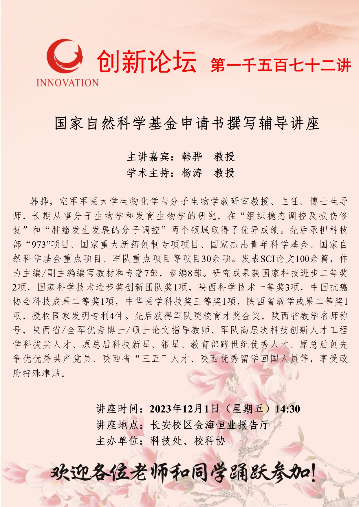 韩骅 教授 bat365正版唯一官网创新论坛第一千五百七十二讲:国家自然科学基金申请书撰写辅导讲座 讲座时间 2023年12月1日(星期五)14:30 讲座地点 长安校区金海恒业报告厅 讲座人介绍 韩骅 教授 讲座内容