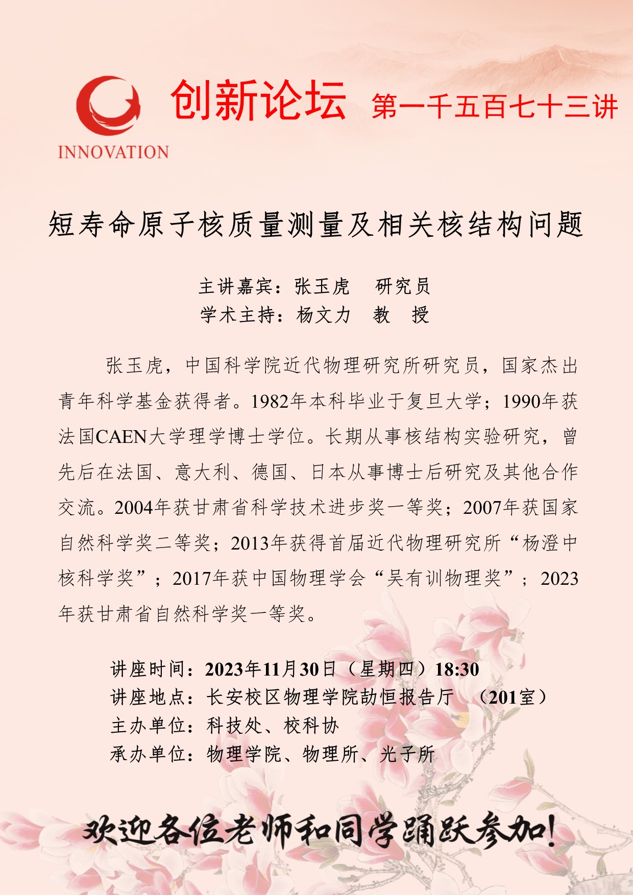 张玉虎 研究员 bat365正版唯一官网创新论坛第一千五百七十三讲:短寿命原子核质量测量及相关核结构问题 讲座时间 2023年11月30日(星期四)18:30 讲座地点 长安校区物理学院劼恒报告厅 (201室) 讲座人介绍 张玉虎 研究员 讲座内容