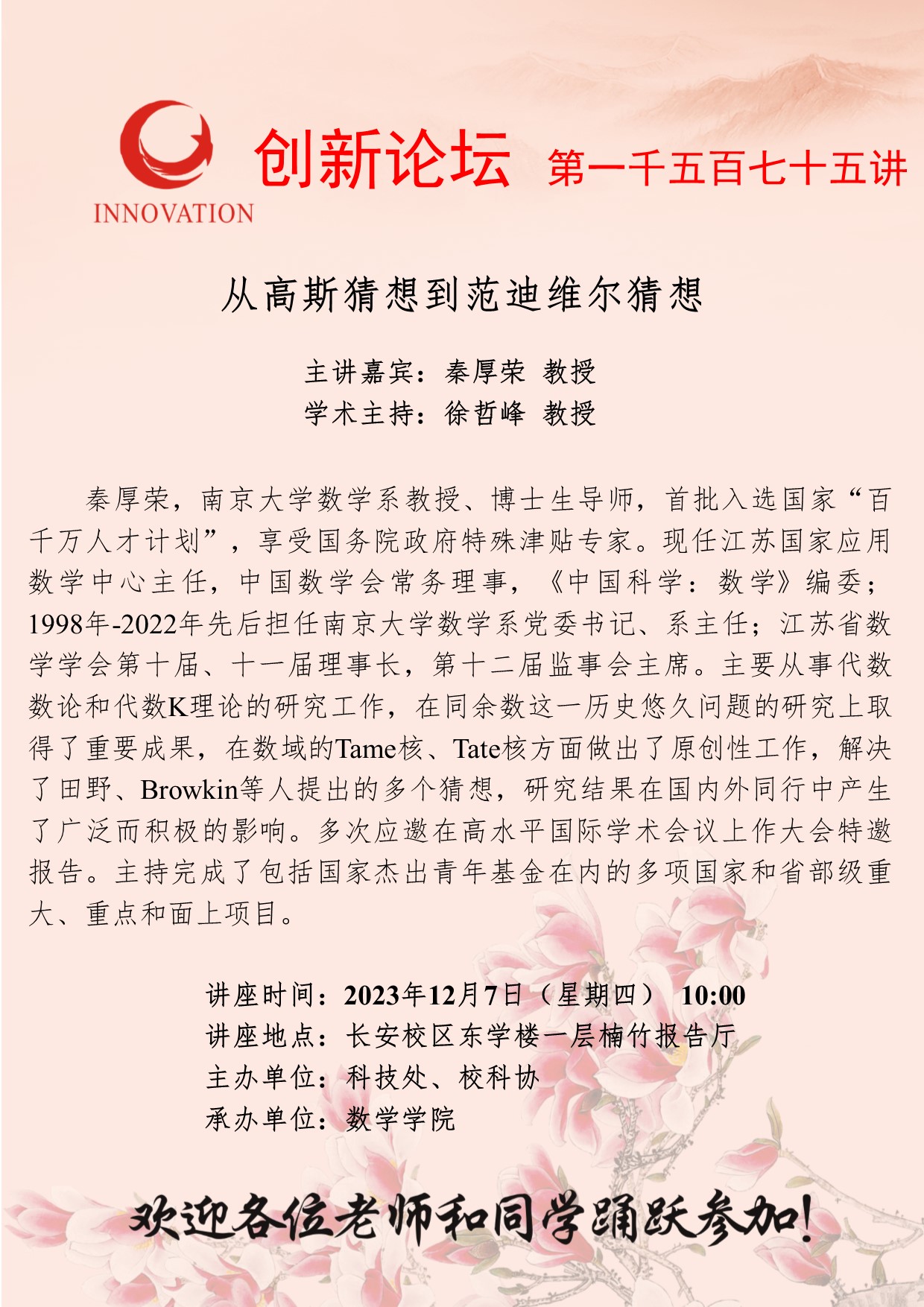 秦厚荣 教授 bat365正版唯一官网创新论坛第一千五百七十五讲:从高斯猜想到范迪维尔猜想 讲座时间 2023年12月7日(星期四) 10:00 讲座地点 长安校区东学楼一层楠竹报告厅 讲座人介绍 秦厚荣 教授 讲座内容