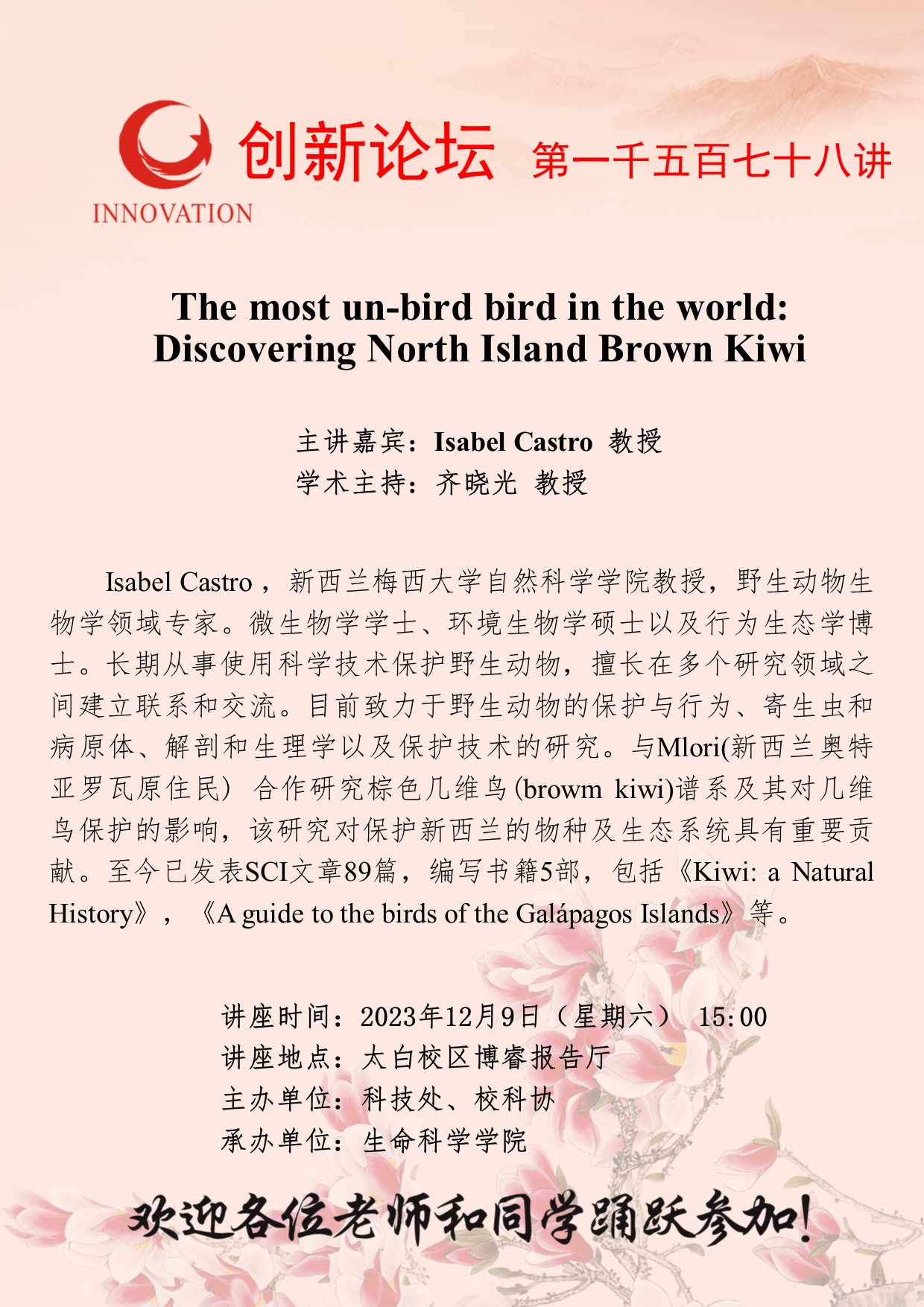 Isabel Castro 教授 bat365正版唯一官网创新论坛第一千五百七十八讲:The most un-bird bird in the world: Discovering North Island Brown Kiwi 讲座时间 2023年12月9日(星期六) 15:00 讲座地点 太白校区博睿报告厅 讲座人介绍 Isabel Castro 教授 讲座内容