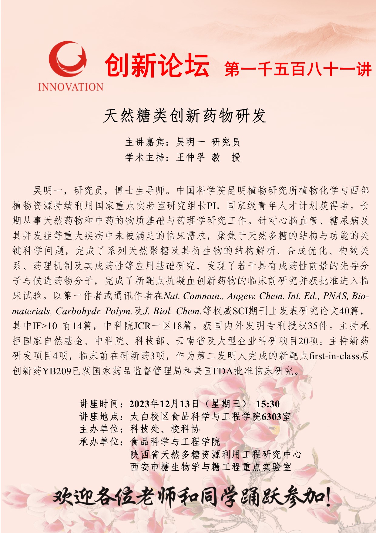吴明一 研究员 bat365正版唯一官网创新论坛第一千五百八十一讲:天然糖类创新药物研发 讲座时间 2023年12月13日(星期三) 15:30 讲座地点 太白校区食品科学与工程学院6303室 讲座人介绍 吴明一 研究员 讲座内容