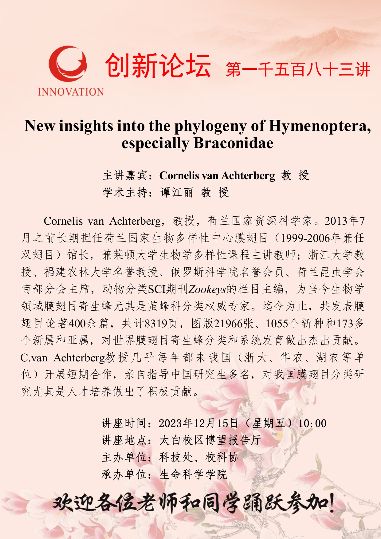 Cornelis van Achterberg 教 授 bat365正版唯一官网创新论坛第一千五百八十三讲:New insights into the phylogeny of Hymenoptera, especially Braconidae 讲座时间 2023年12月15日(星期五)10:00 讲座地点 太白校区博望报告厅 讲座人介绍 Cornelis van Achterberg 教 授 讲座内容