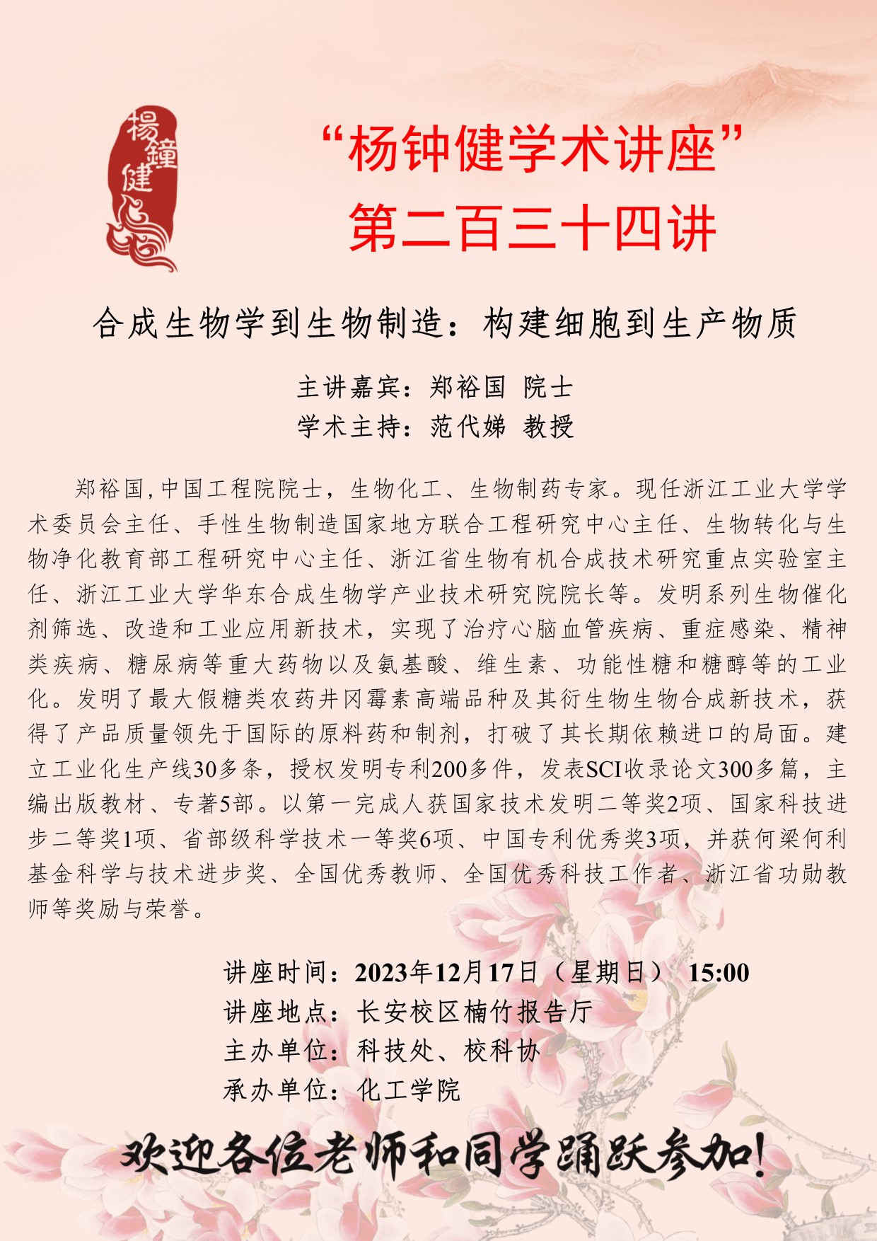 郑裕国 院士 “杨钟健学术讲座”第二百三十四讲:合成生物学到生物制造:构建细胞到生产物质 讲座时间 2023年12月17日(星期日) 15:00 讲座地点 长安校区楠竹报告厅 讲座人介绍 郑裕国 院士 讲座内容
