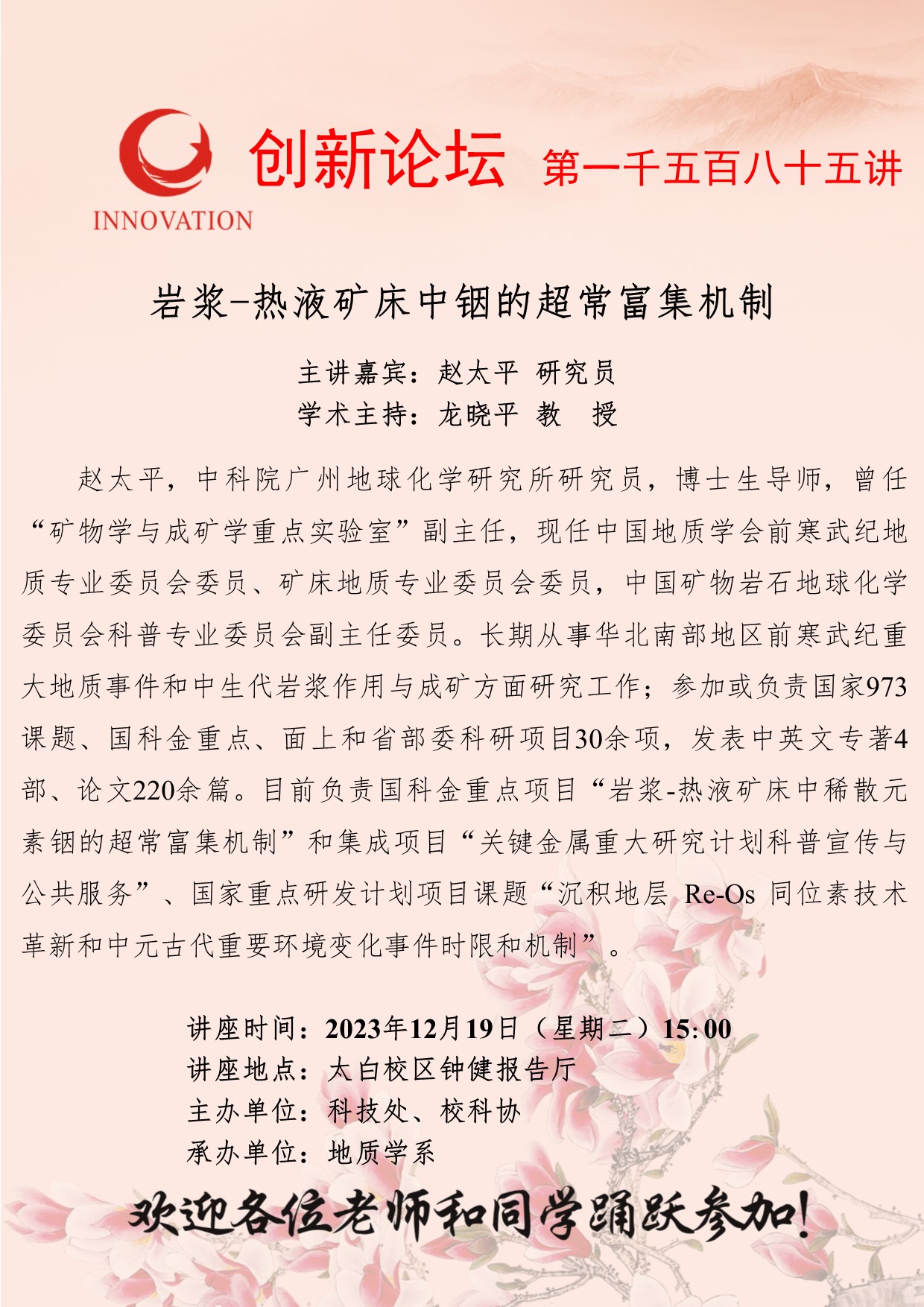 赵太平 研究员 bat365正版唯一官网创新论坛第一千五百八十五讲:岩浆-热液矿床中铟的超常富集机制 讲座时间 2023年12月19日(星期二)15:00 讲座地点 太白校区钟健报告厅 讲座人介绍 赵太平 研究员 讲座内容