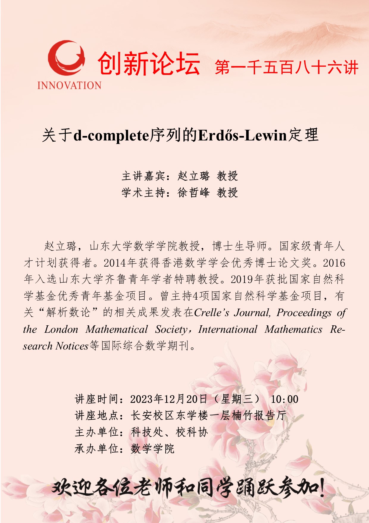 赵立璐 教授 bat365正版唯一官网创新论坛第一千五百八十六讲:关于d-complete序列的Erdős-Lewin定理 讲座时间 2023年12月20日(星期三) 10:00 讲座地点 长安校区东学楼一层楠竹报告厅 讲座人介绍 赵立璐 教授 讲座内容