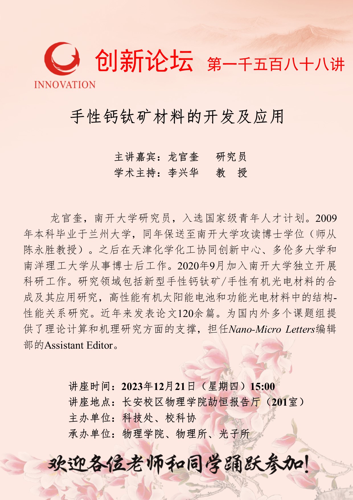 龙官奎 研究员 bat365正版唯一官网创新论坛第一千五百八十八讲:手性钙钛矿材料的开发及应用 讲座时间 2023年12月21日(星期四)15:00 讲座地点 长安校区物理学院劼恒报告厅(201室) 讲座人介绍 龙官奎 研究员 讲座内容
