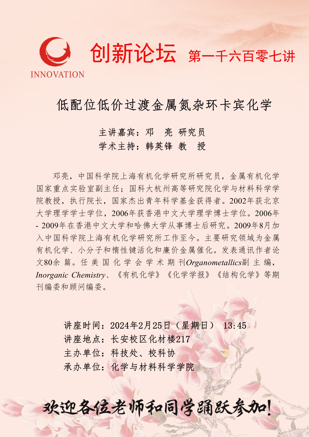 邓亮 研究员 bat365正版唯一官网创新论坛第一千六百零七讲: 低配位低价过渡金属氮杂环卡宾化学 讲座时间 2024年2月25日(星期日) 13:45 讲座地点 长安校区化材楼217 讲座人介绍 邓亮 研究员 讲座内容
