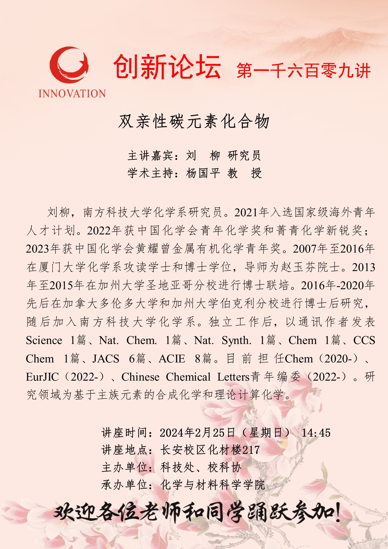 刘柳 研究员 bat365正版唯一官网创新论坛第一千六百零九讲:双亲性碳元素化合物 讲座时间 2024年2月25日(星期日) 14:45 讲座地点 长安校区化材楼217 讲座人介绍 刘柳 研究员 讲座内容