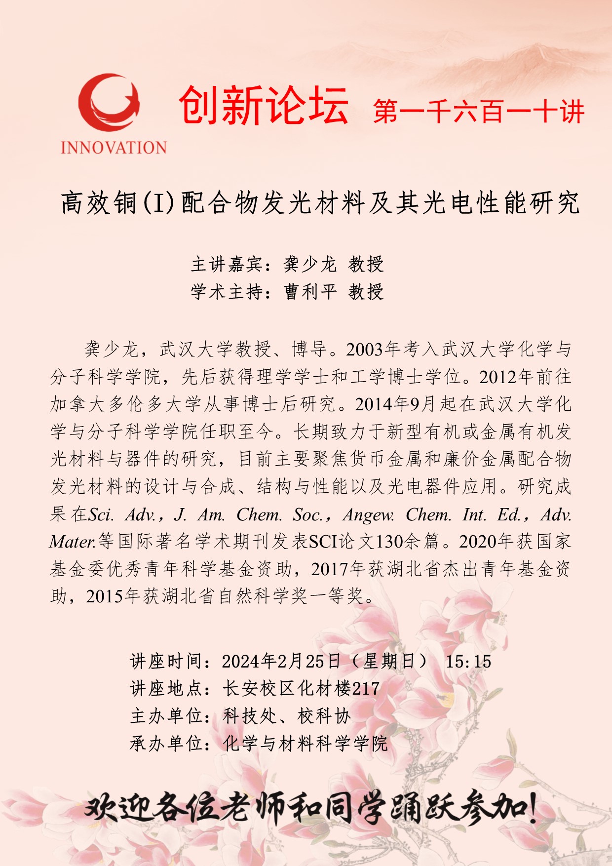 龚少龙 教授 bat365正版唯一官网创新论坛第一千六百一十讲:高效铜(I)配合物发光材料及其光电性能研究 讲座时间 2024年2月25日(星期日) 15:15 讲座地点 长安校区化材楼217 讲座人介绍 龚少龙 教授 讲座内容